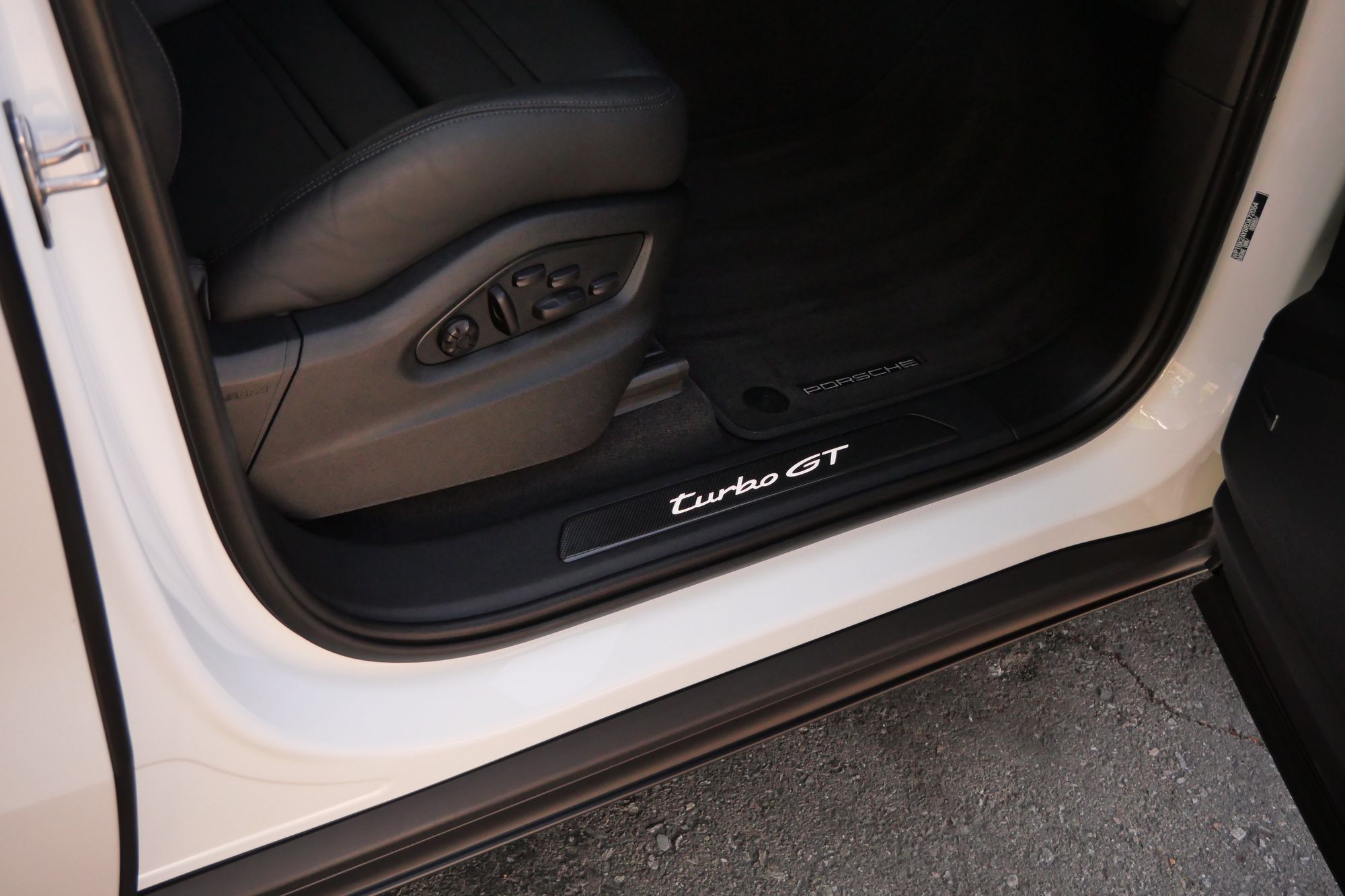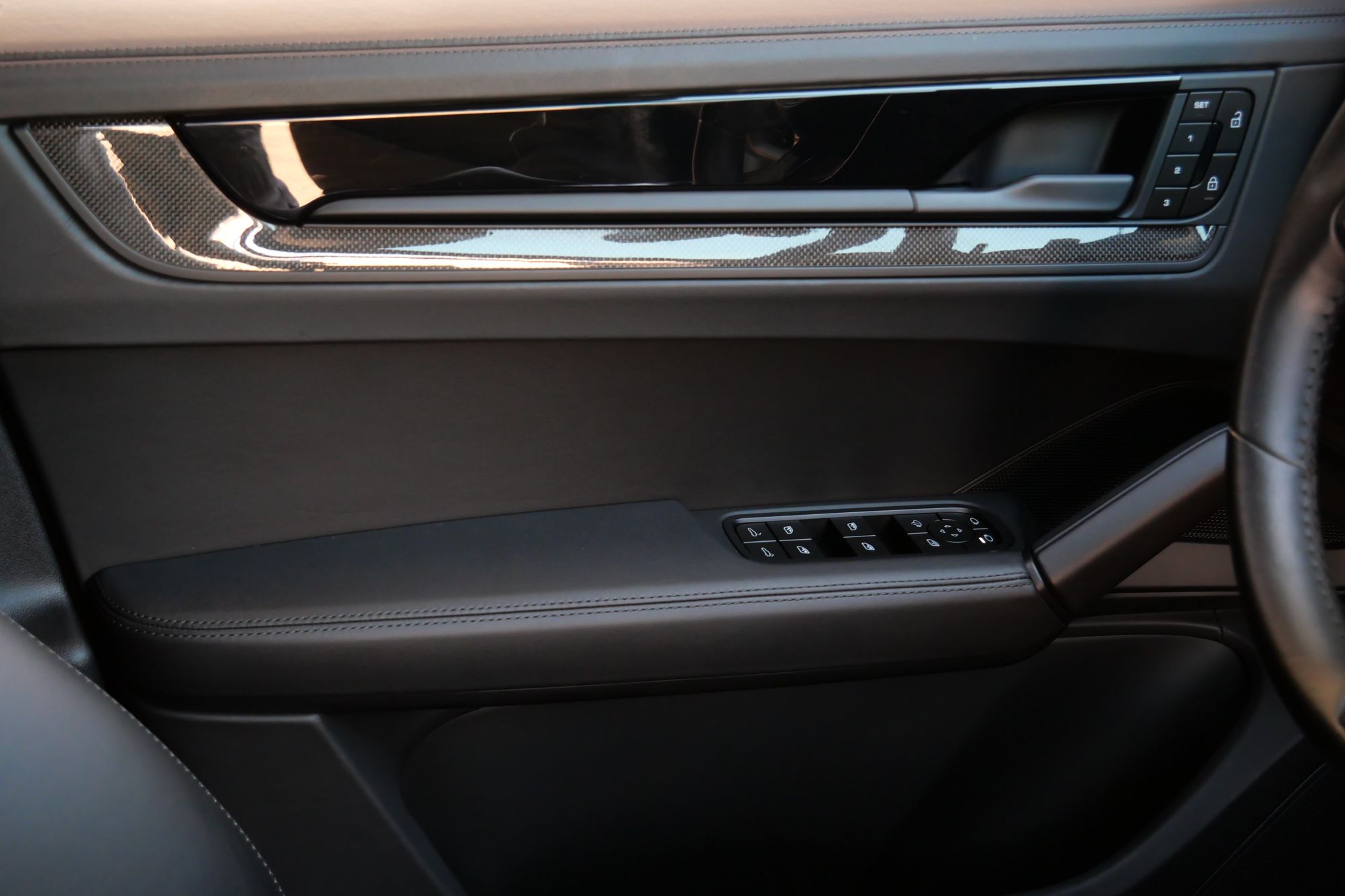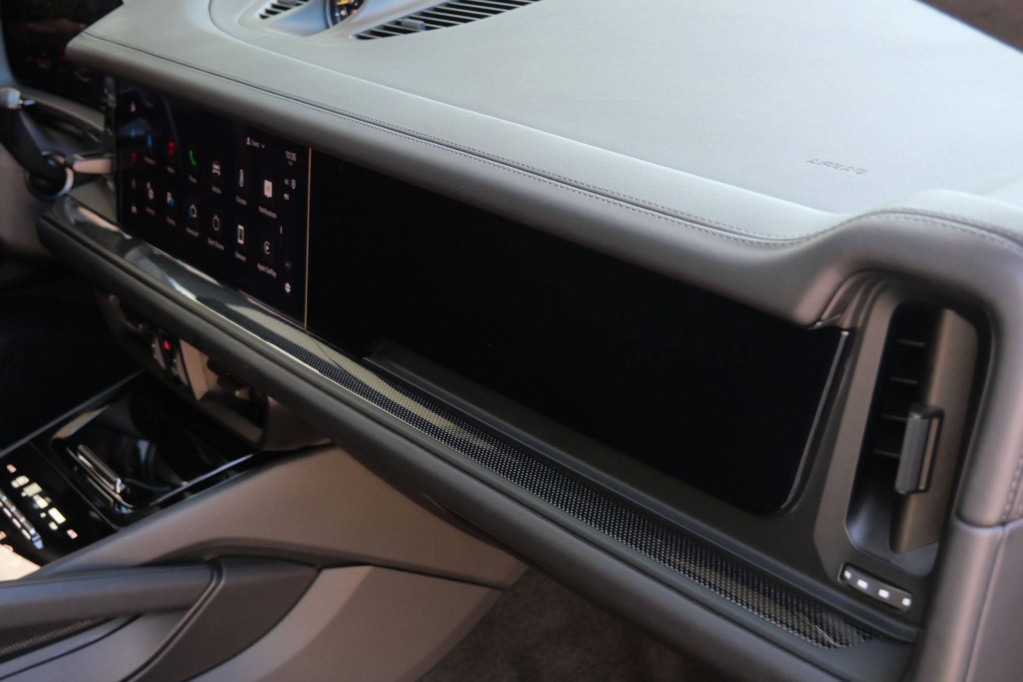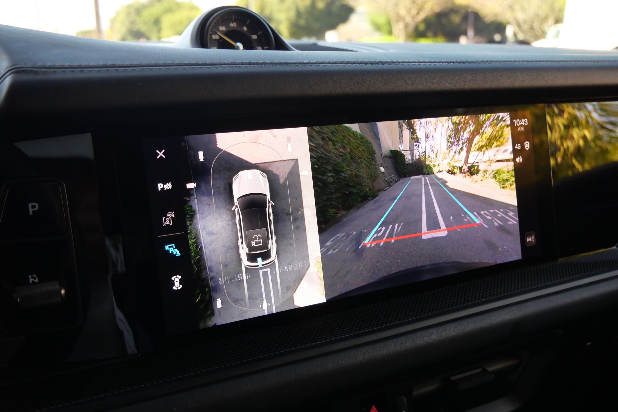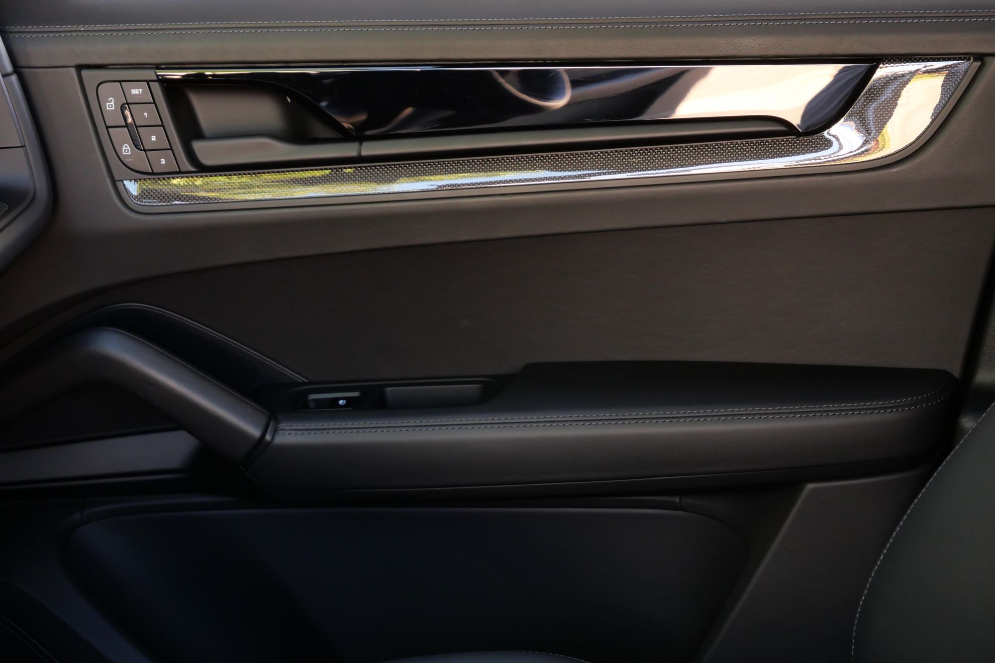 Black leather extends from the heated 18-way Adaptive Sports Seats Plus front seats to the heated rear seats. Carbon-fiber trim accents the cabin, and amenities include four-zone automatic climate control, front-seat position memory, a Bose surround sound system, illuminated doorsill guards, a surround view camera system, Active Parking Support, and Porsche Communication Management with navigation, voice control, and a 12.3″ touchscreen display.