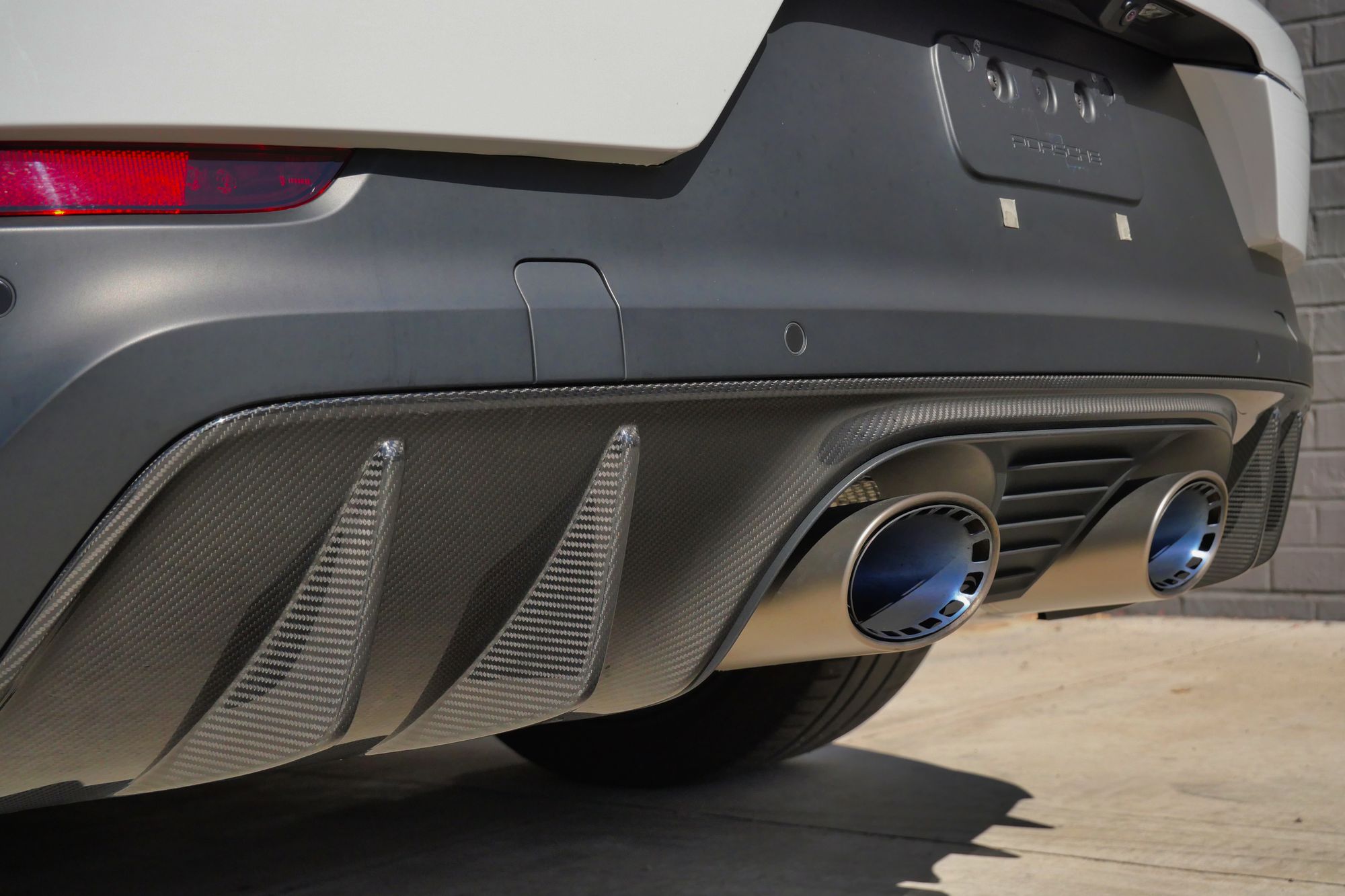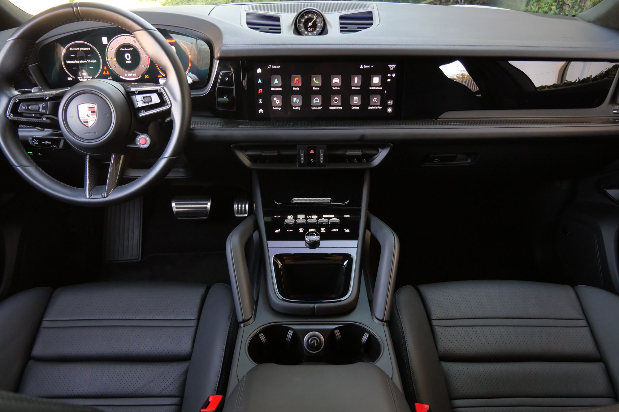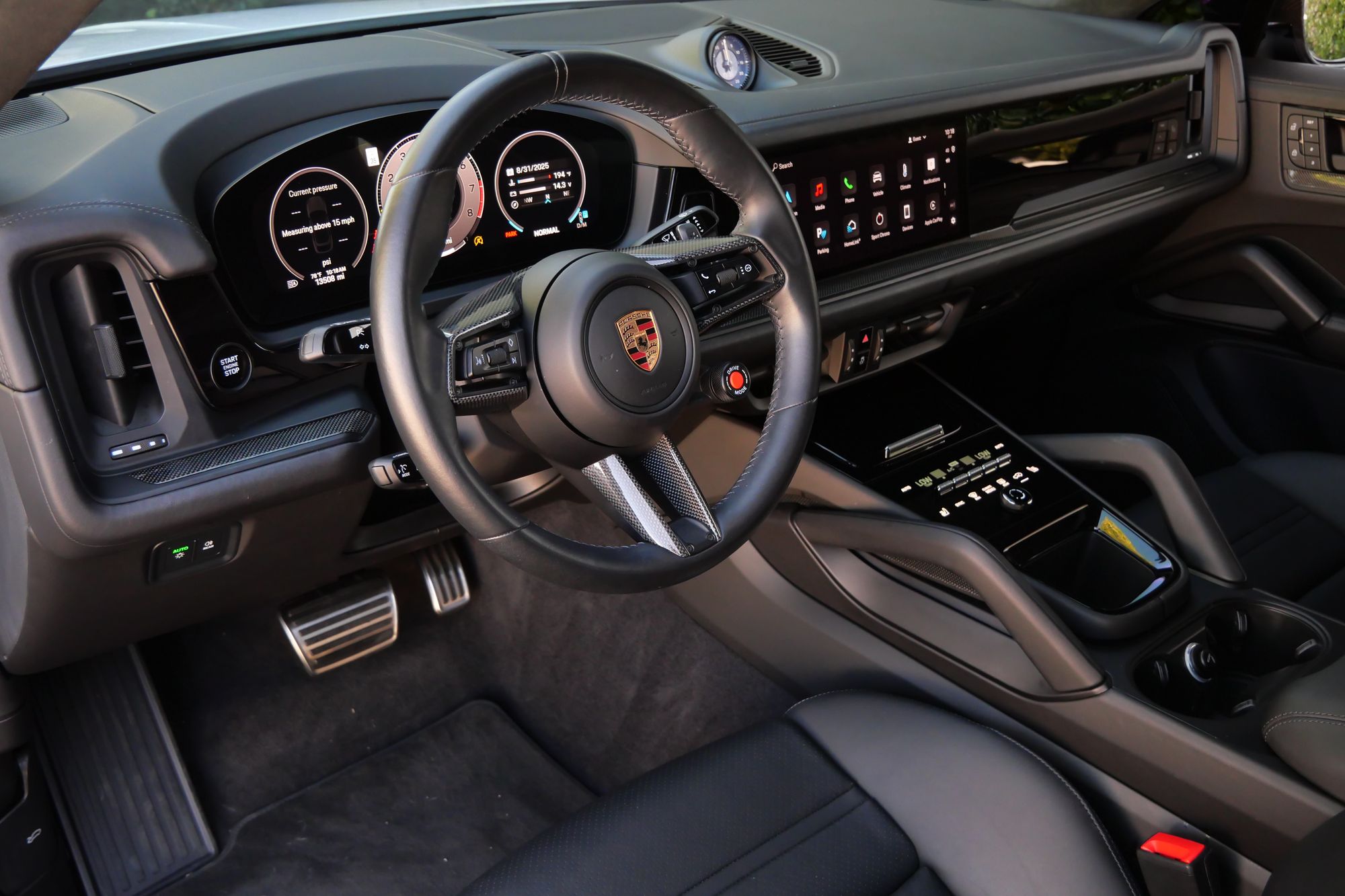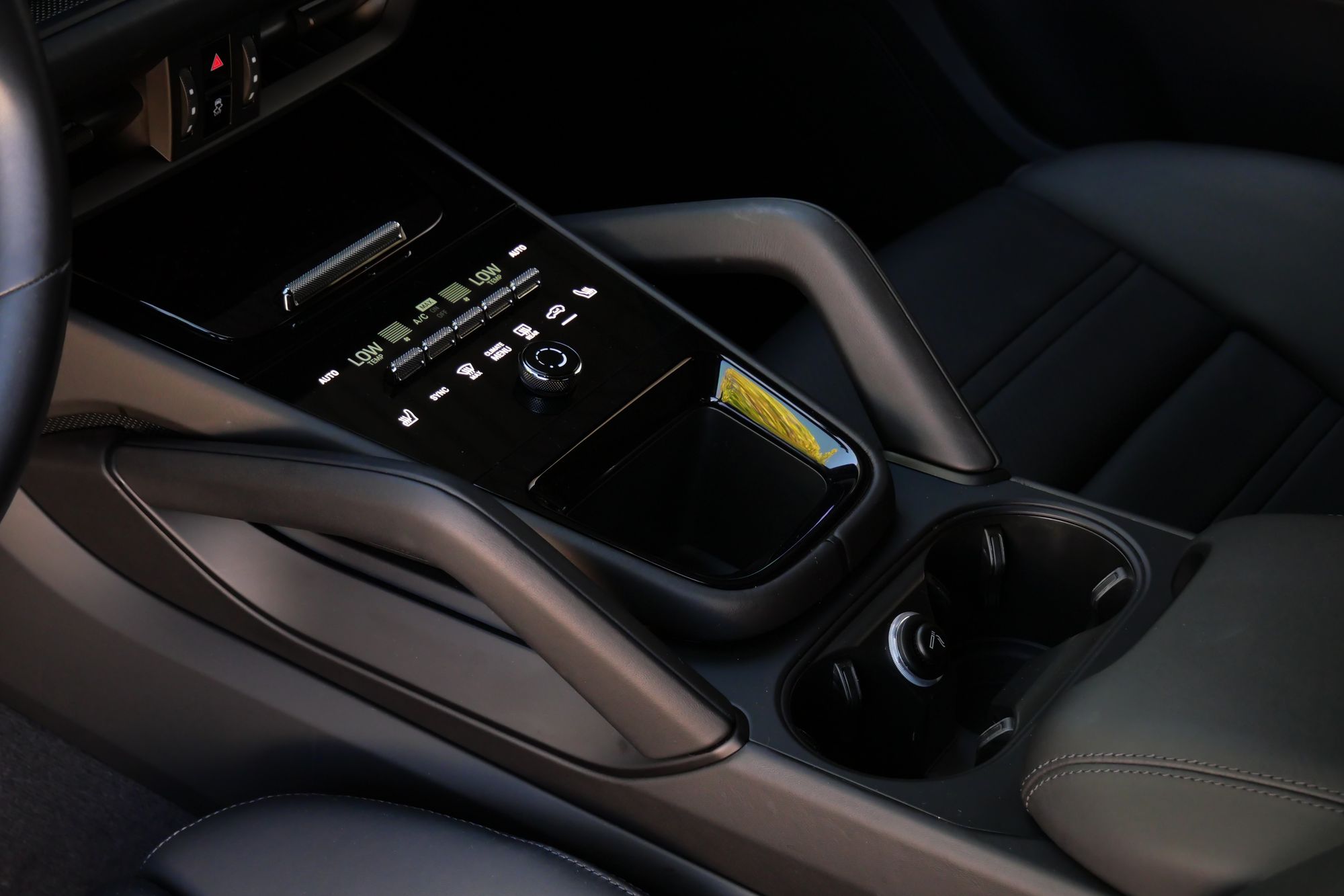 Black leather extends from the heated 18-way Adaptive Sports Seats Plus front seats to the heated rear seats. Carbon-fiber trim accents the cabin, and amenities include four-zone automatic climate control, front-seat position memory, a Bose surround sound system, illuminated doorsill guards, a surround view camera system, Active Parking Support, and Porsche Communication Management with navigation, voice control, and a 12.3″ touchscreen display.