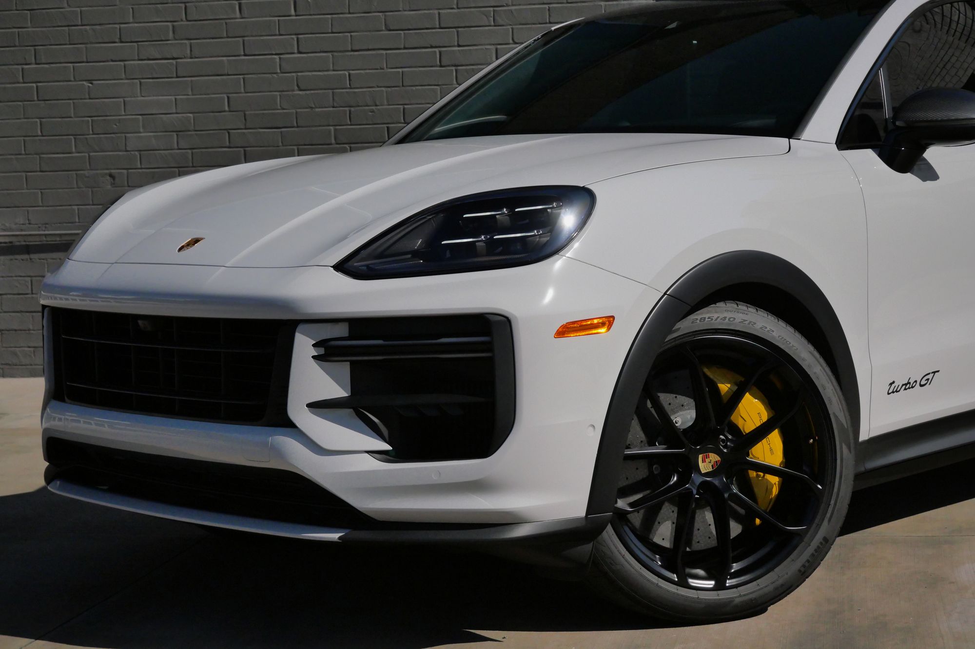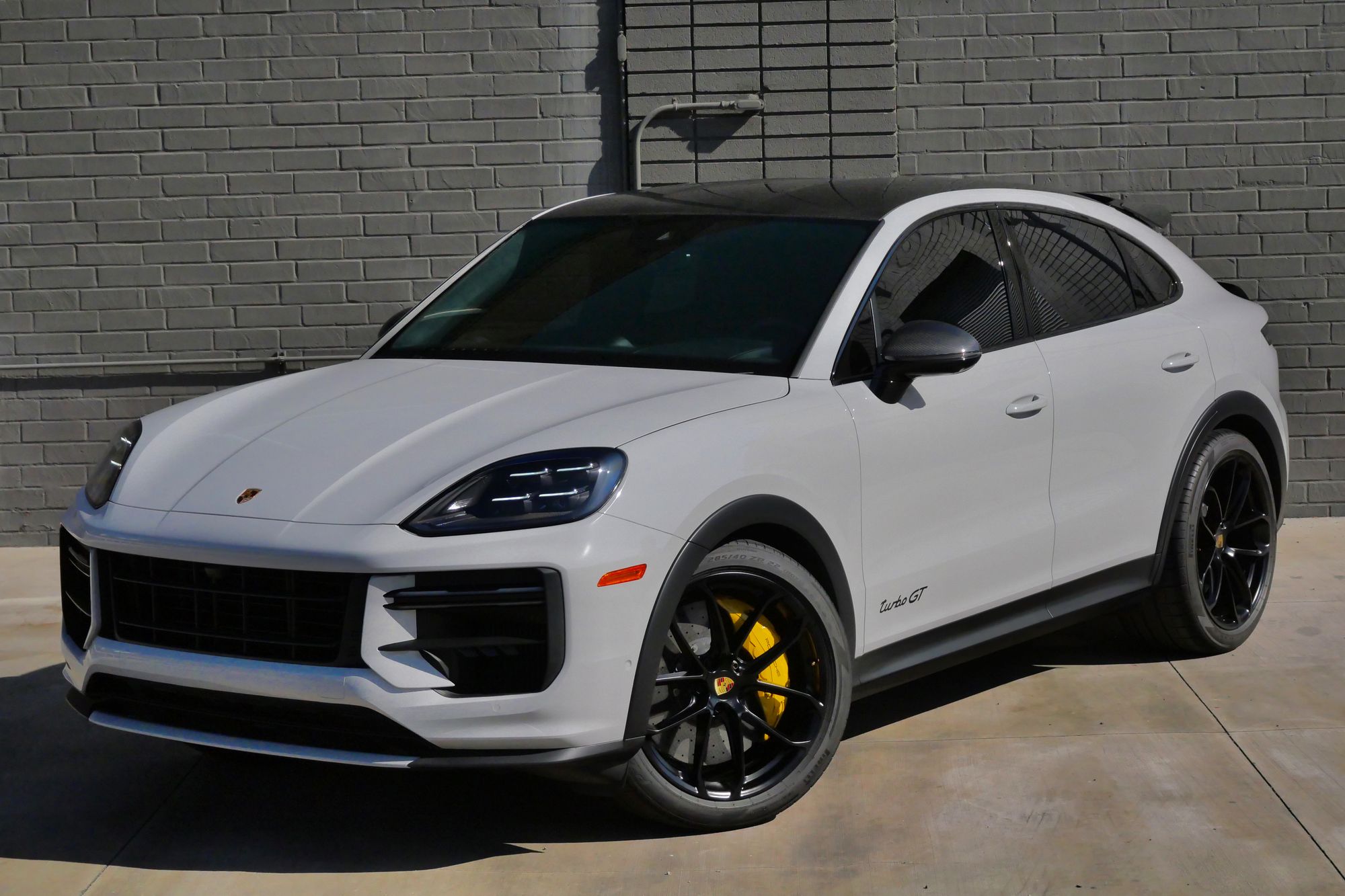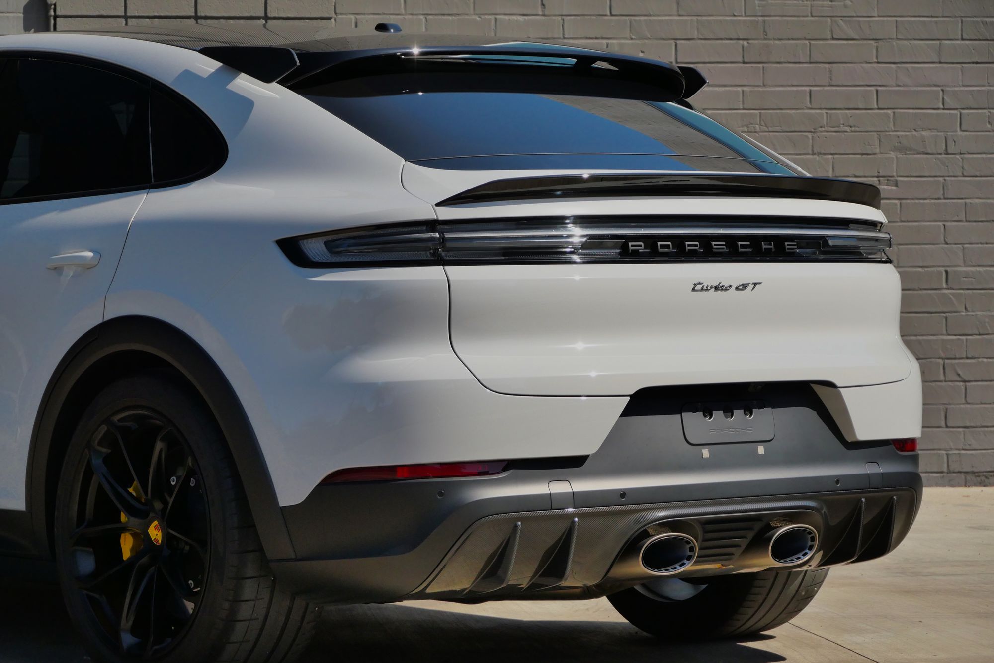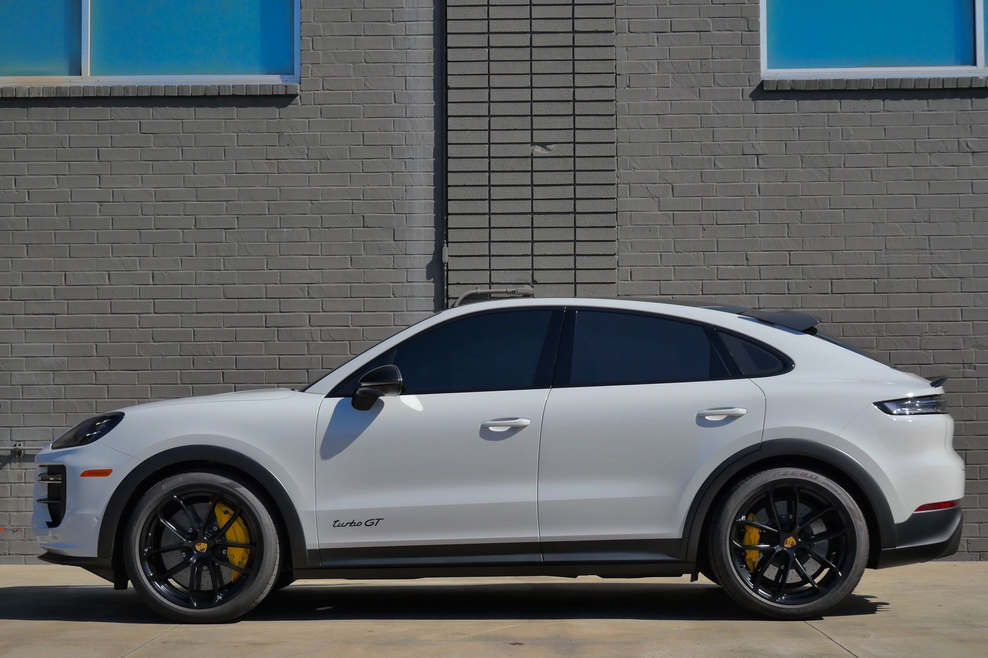 This 2024 Porsche Cayenne Turbo GT has a Chalk vinyl wrap over white paint, and is powered by a twin-turbocharged 4.0-liter V8 linked with an eight-speed Tiptronic S automatic transmission and an all-wheel-drive system. It rides on 22″ GT Design wheels and is further equipped with a carbon-fiber roof and exterior accents, Exclusive Design taillights, soft-close doors, carbon-ceramic brakes, and a surround view camera system. On the inside, heated 18-way Adaptive Sport Seats Plus front seats and heated rear seats trimmed in black leather are accompanied by a Bose surround sound system, four-zone automatic climate control, and Porsche Communication Management.