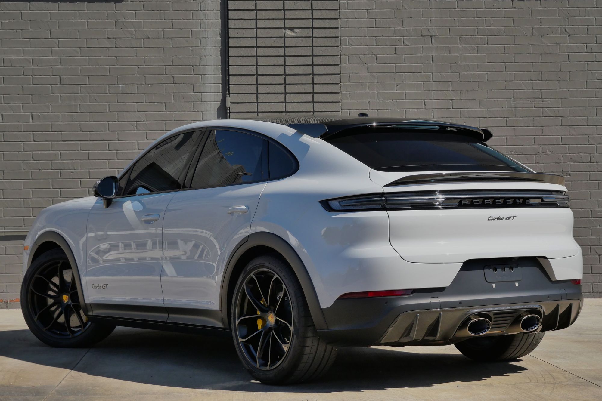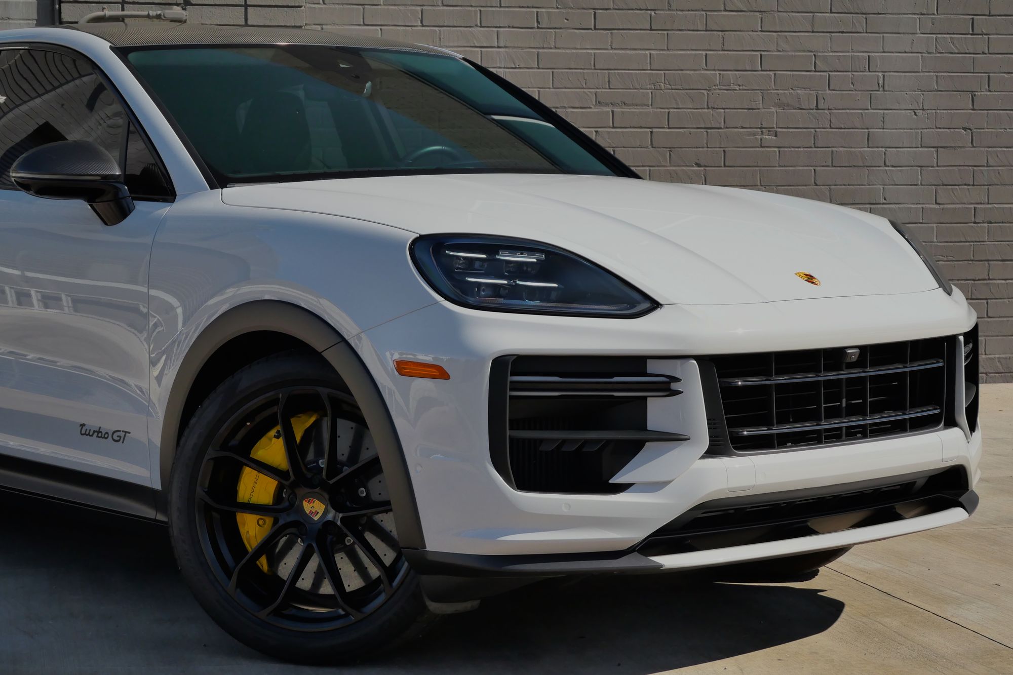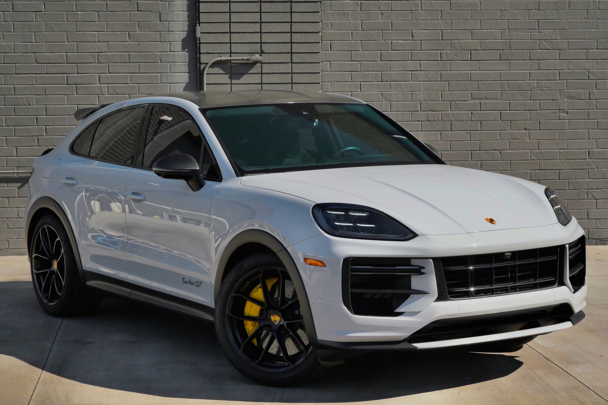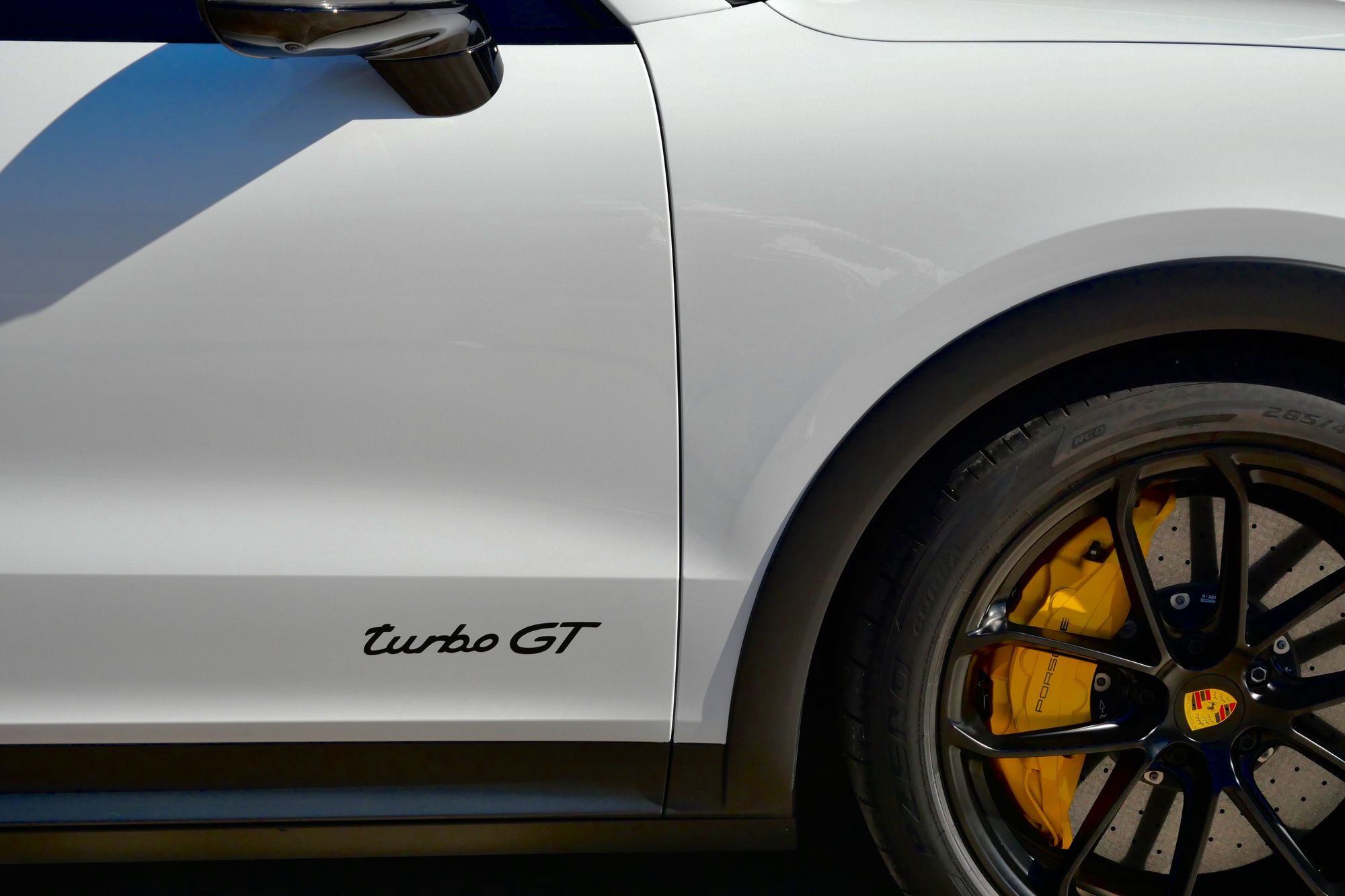 This 2024 Porsche Cayenne Turbo GT has a Chalk vinyl wrap over white paint, and is powered by a twin-turbocharged 4.0-liter V8 linked with an eight-speed Tiptronic S automatic transmission and an all-wheel-drive system. It rides on 22″ GT Design wheels and is further equipped with a carbon-fiber roof and exterior accents, Exclusive Design taillights, soft-close doors, carbon-ceramic brakes, and a surround view camera system. On the inside, heated 18-way Adaptive Sport Seats Plus front seats and heated rear seats trimmed in black leather are accompanied by a Bose surround sound system, four-zone automatic climate control, and Porsche Communication Management.