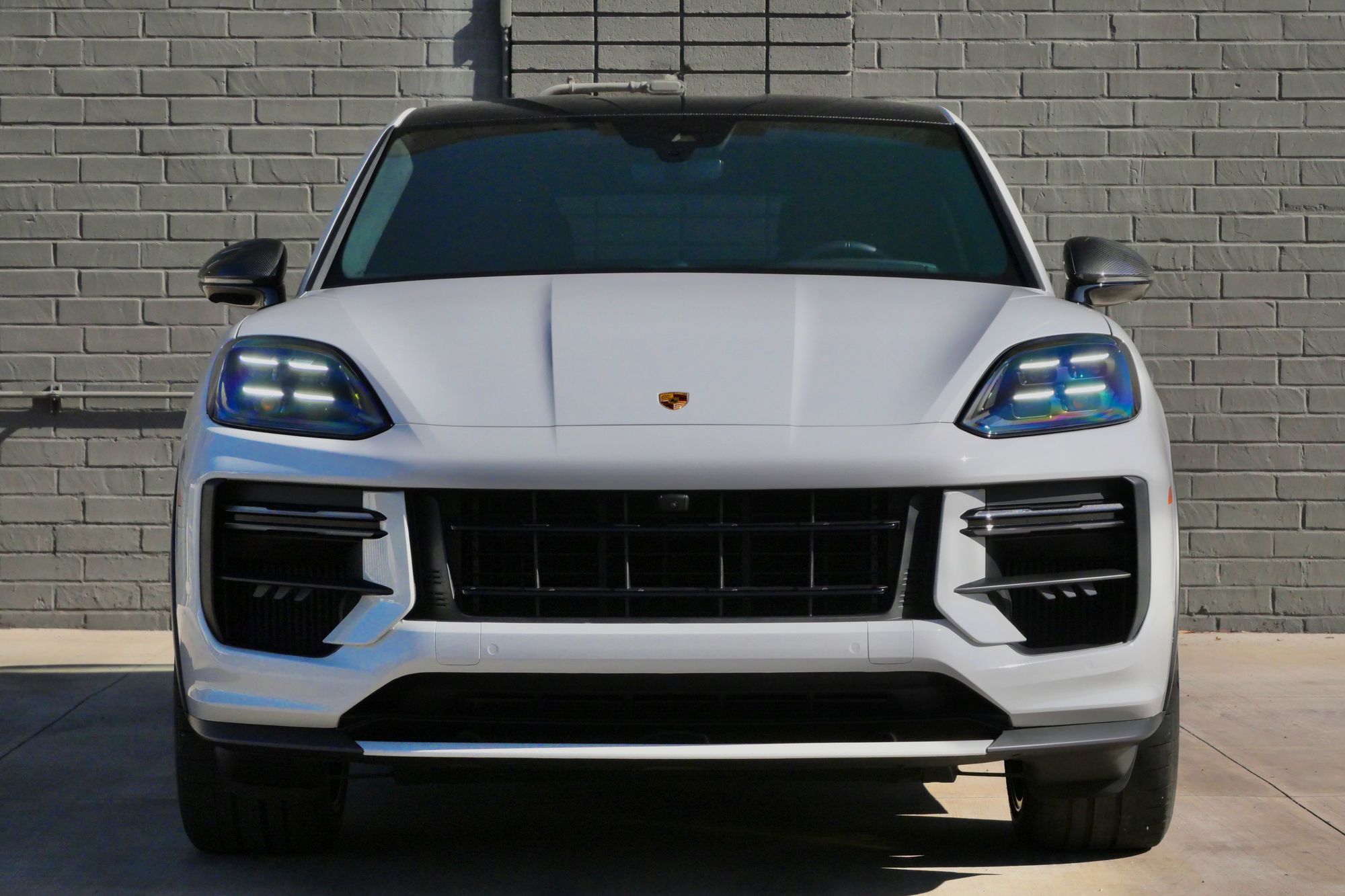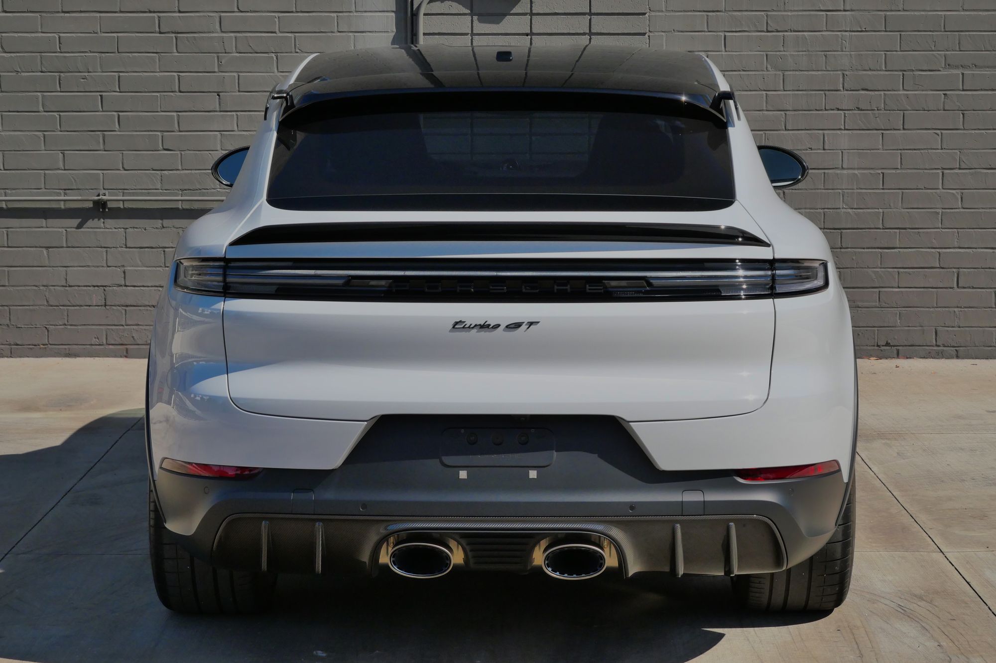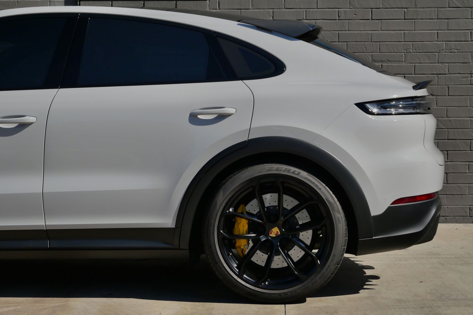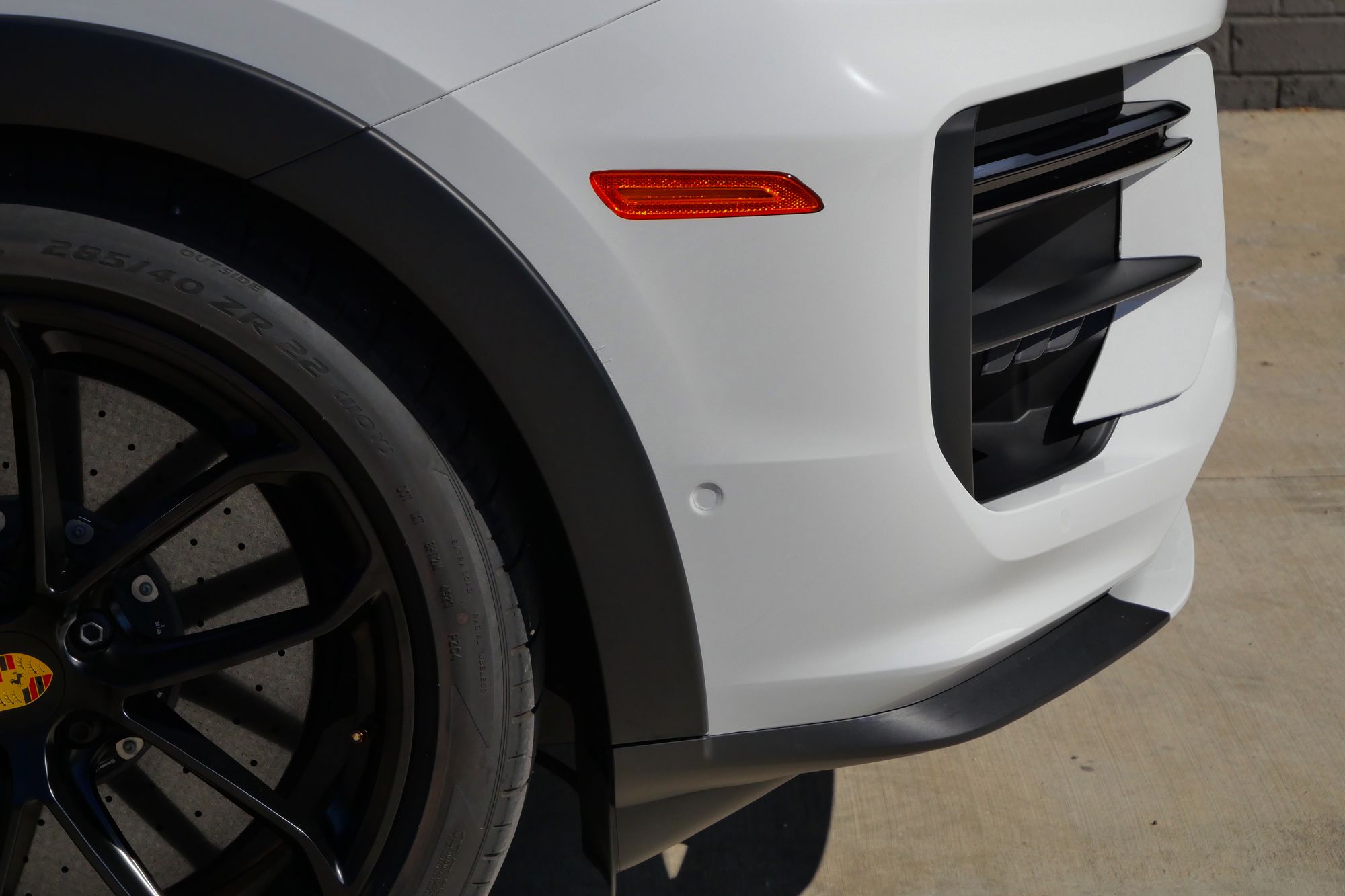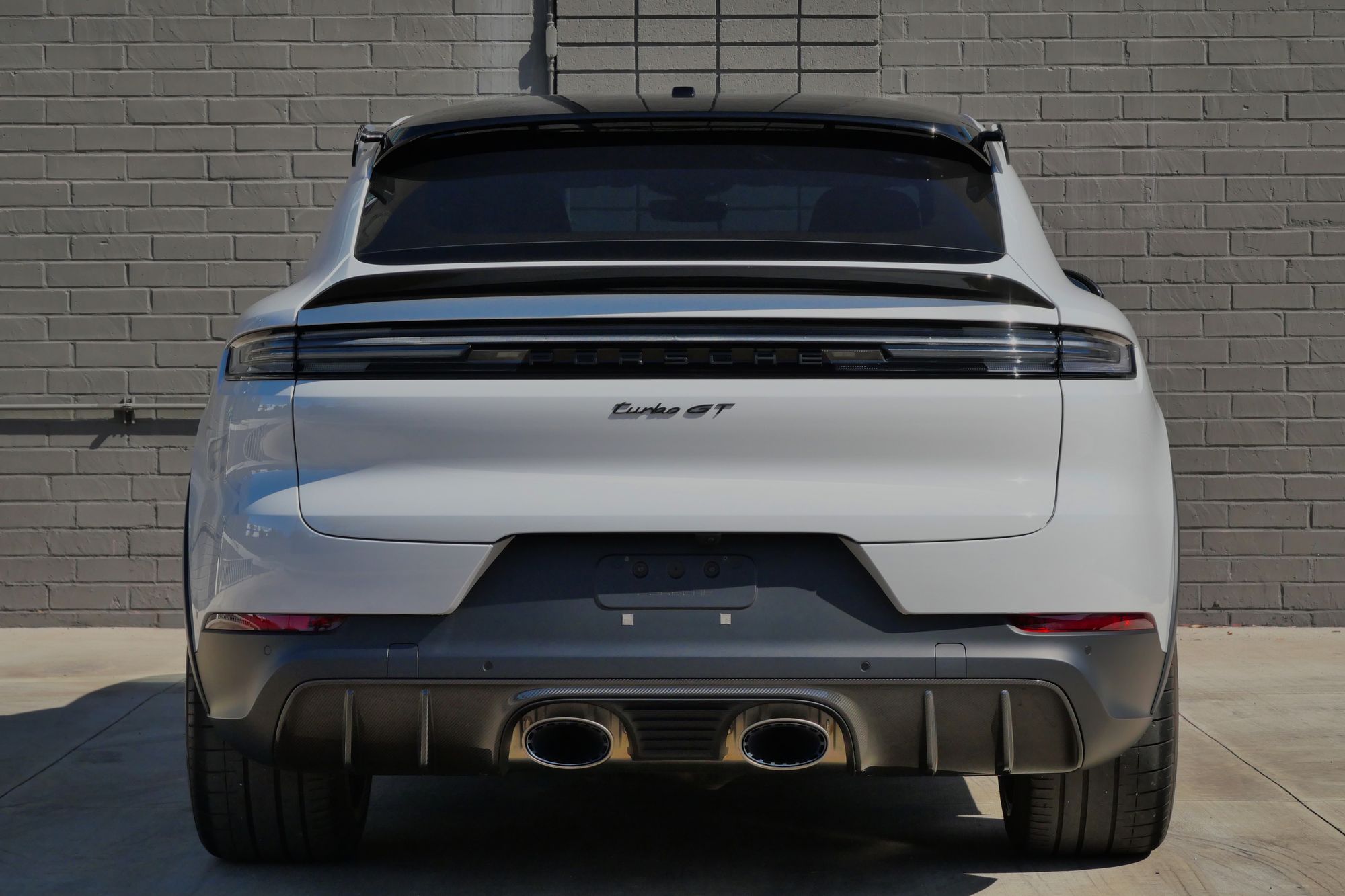 This 2024 Porsche Cayenne Turbo GT has a Chalk vinyl wrap over white paint, and is powered by a twin-turbocharged 4.0-liter V8 linked with an eight-speed Tiptronic S automatic transmission and an all-wheel-drive system. It rides on 22″ GT Design wheels and is further equipped with a carbon-fiber roof and exterior accents, Exclusive Design taillights, soft-close doors, carbon-ceramic brakes, and a surround view camera system. On the inside, heated 18-way Adaptive Sport Seats Plus front seats and heated rear seats trimmed in black leather are accompanied by a Bose surround sound system, four-zone automatic climate control, and Porsche Communication Management.