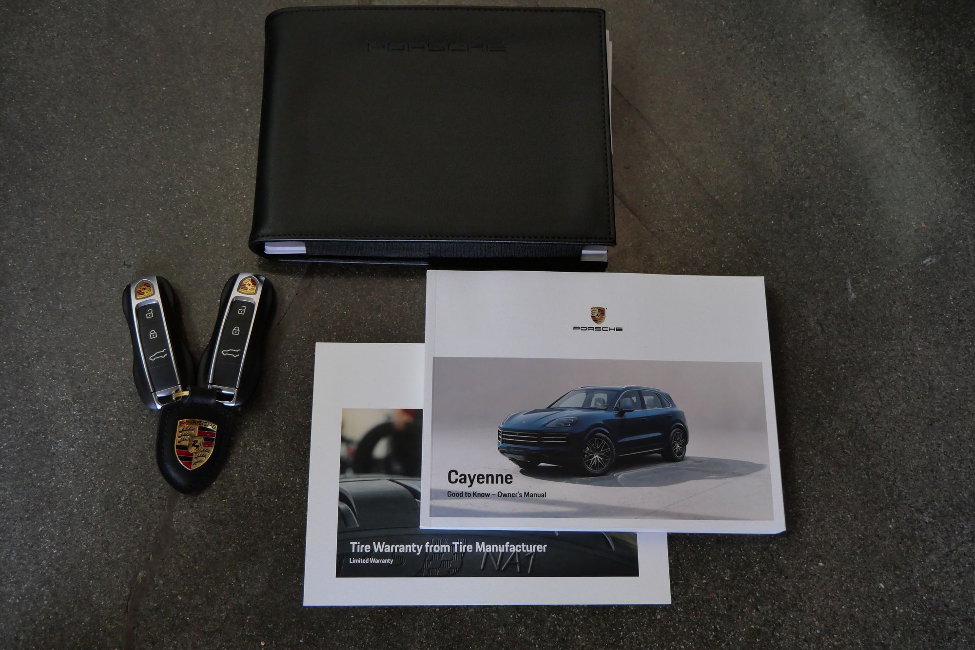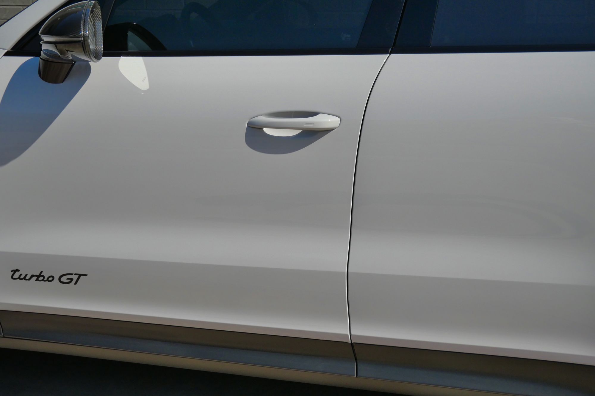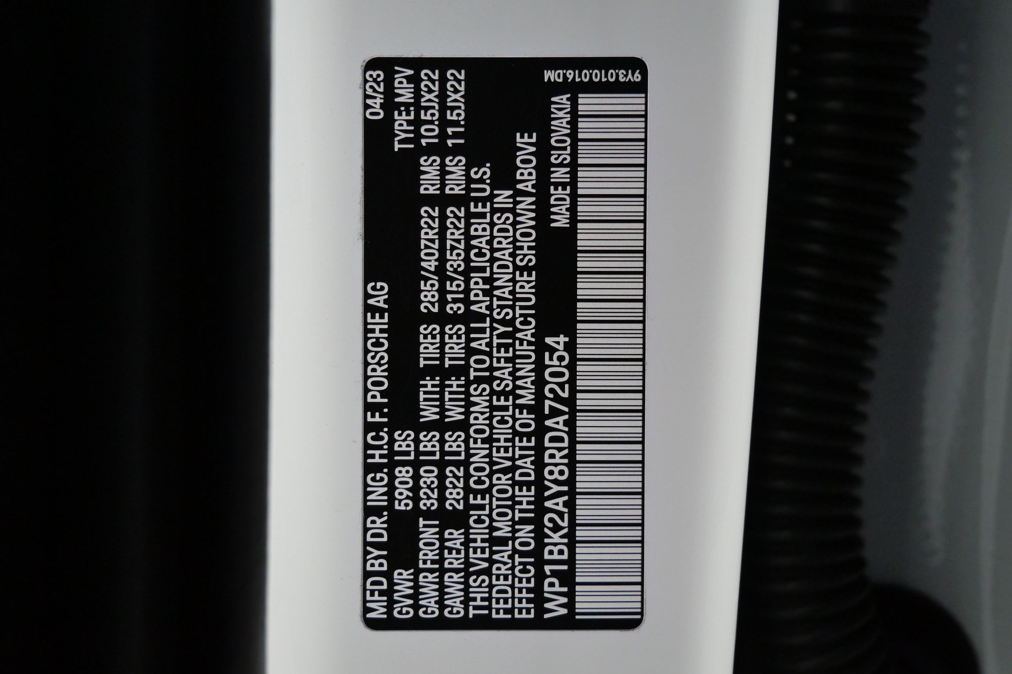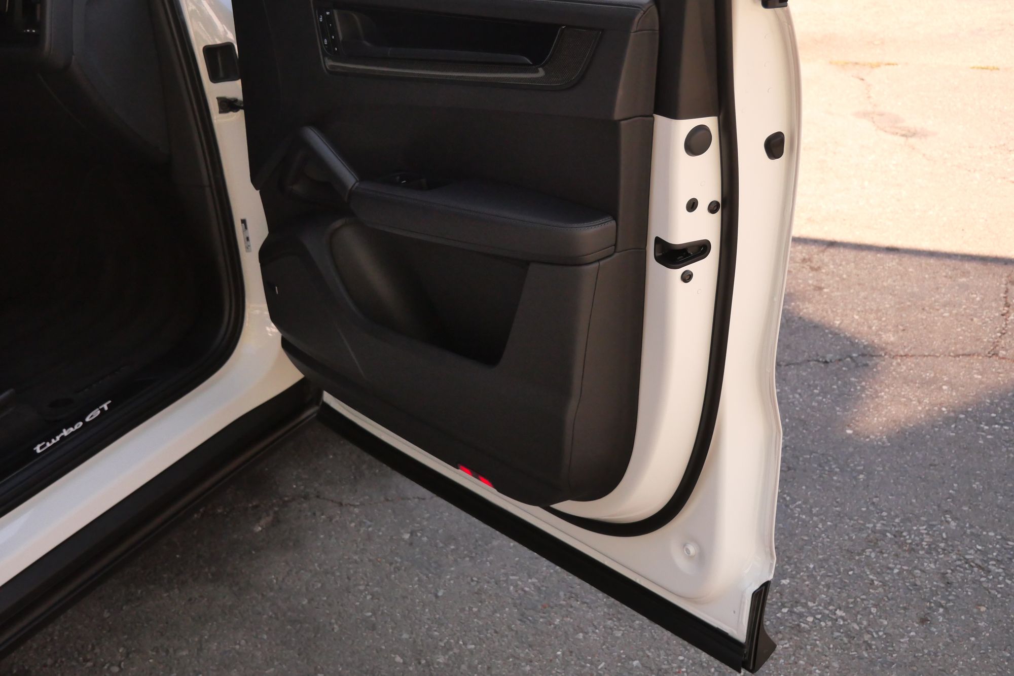 This 2024 Porsche Cayenne Turbo GT has a Chalk vinyl wrap over white paint, and is powered by a twin-turbocharged 4.0-liter V8 linked with an eight-speed Tiptronic S automatic transmission and an all-wheel-drive system. It rides on 22″ GT Design wheels and is further equipped with a carbon-fiber roof and exterior accents, Exclusive Design taillights, soft-close doors, carbon-ceramic brakes, and a surround view camera system. On the inside, heated 18-way Adaptive Sport Seats Plus front seats and heated rear seats trimmed in black leather are accompanied by a Bose surround sound system, four-zone automatic climate control, and Porsche Communication Management.