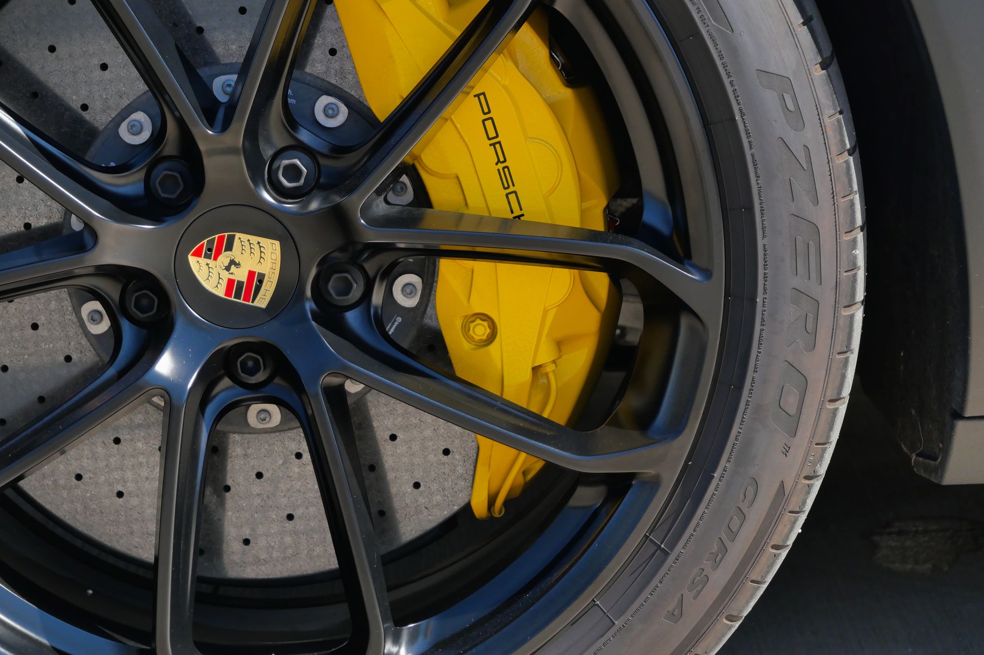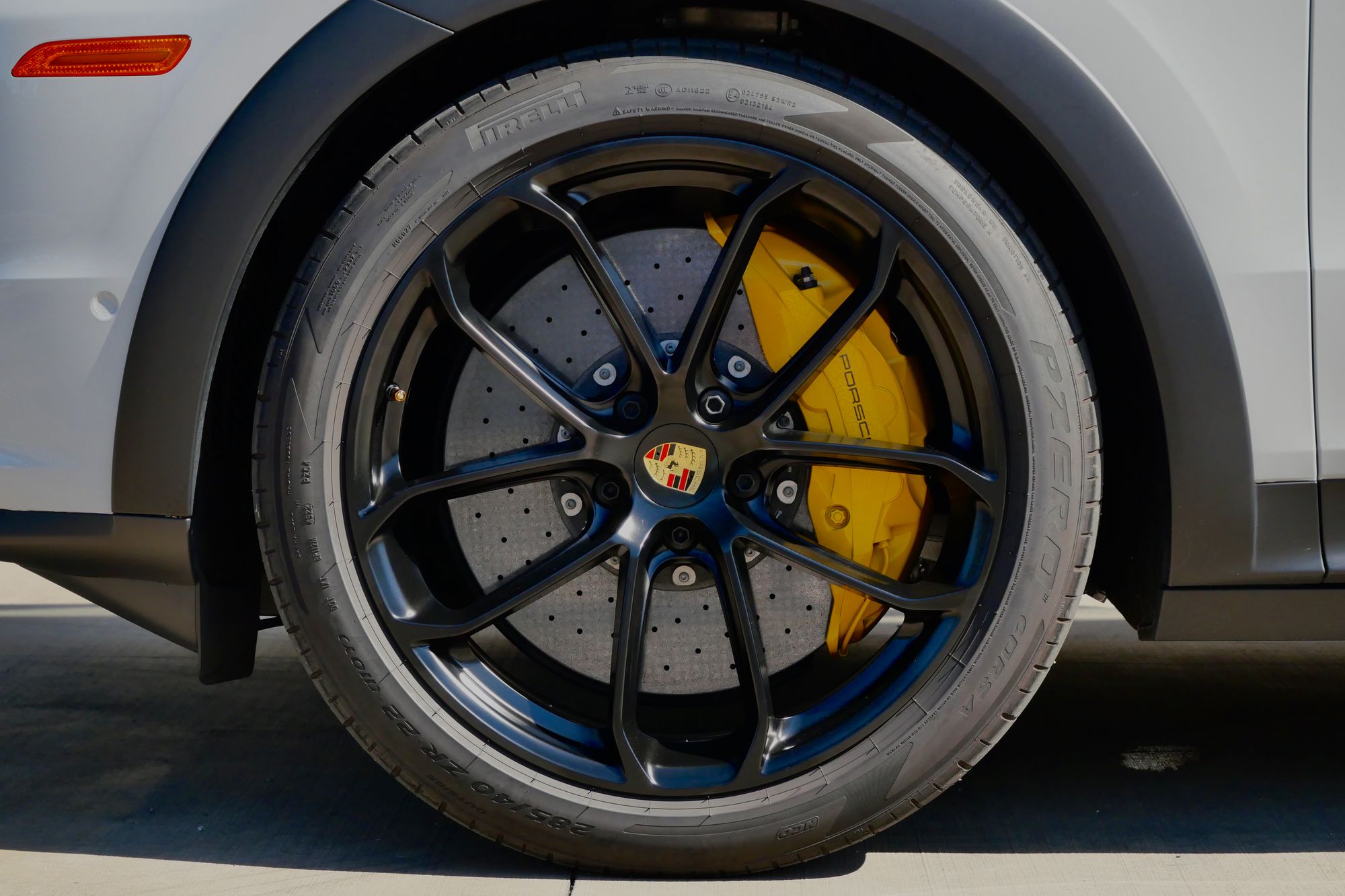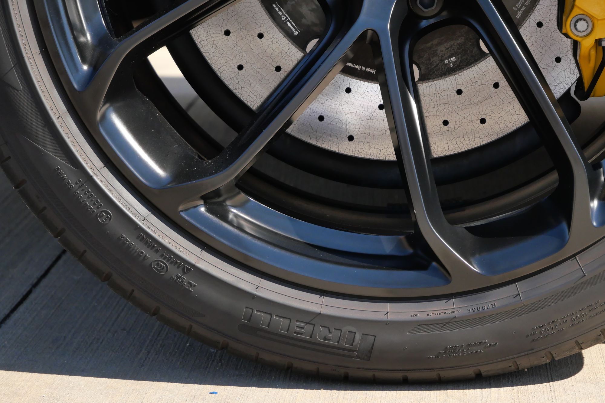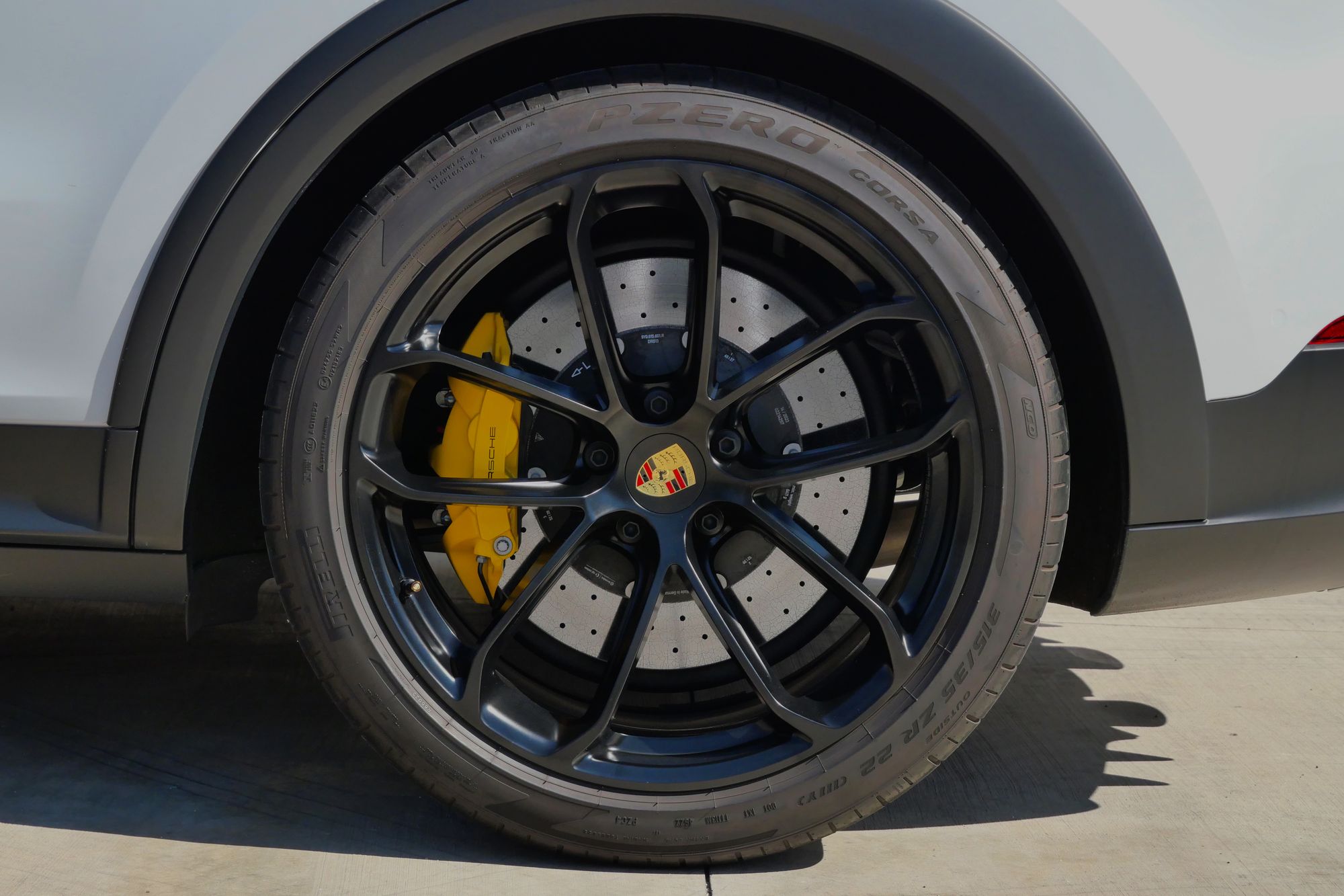 Satin Black-finished 22″ GT Design wheels are mounted with 285/40 front and 315/35 rear Pirelli P Zero Corsa tires. Factory equipment included adjustable air suspension, Porsche Active Suspension Management (PASM), and Porsche Dynamic Chassis Control (PDCC). Braking is provided by Porsche Ceramic Composite Brakes (PCCB) with cross-drilled rotors and yellow-finished calipers.