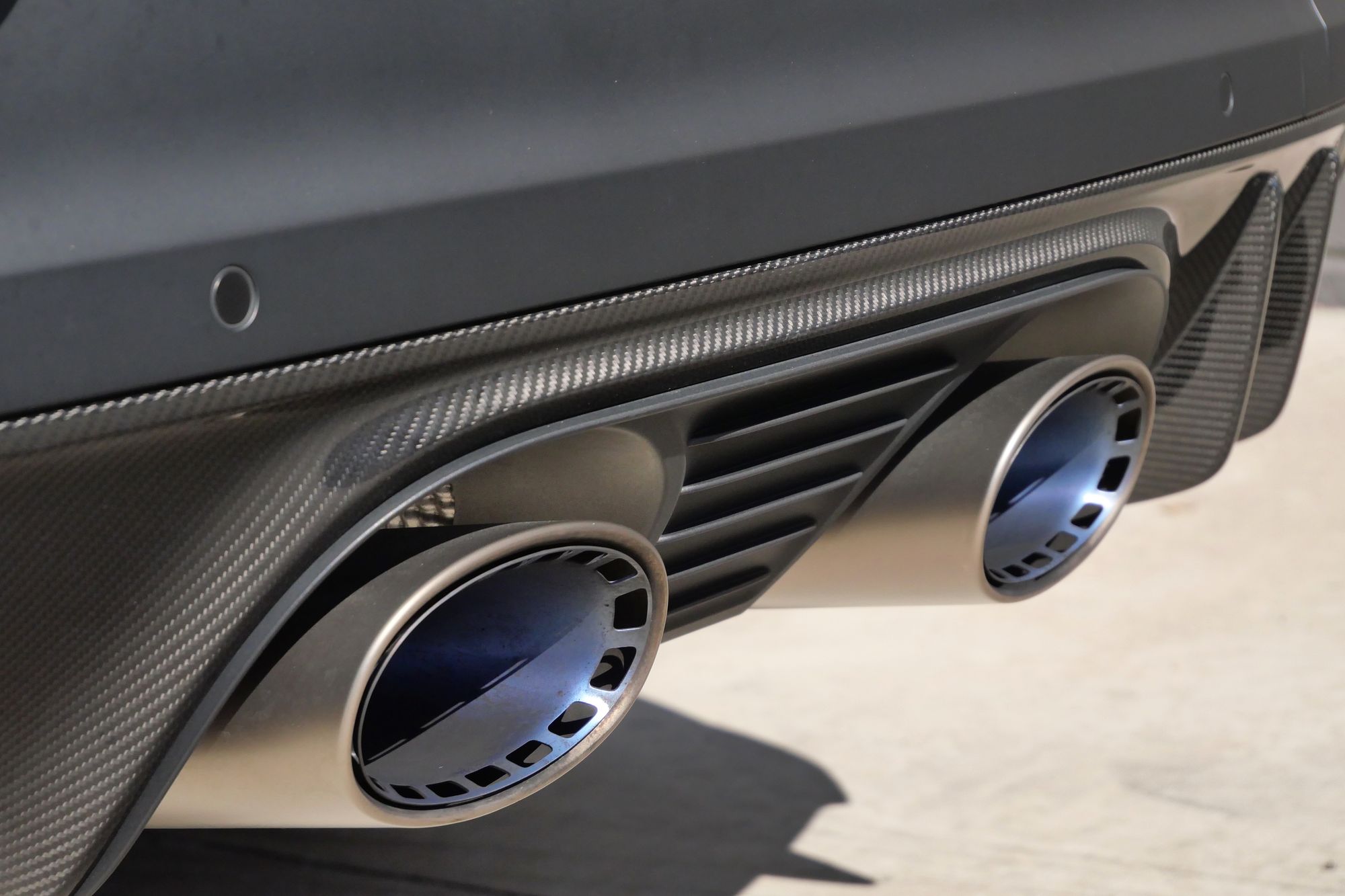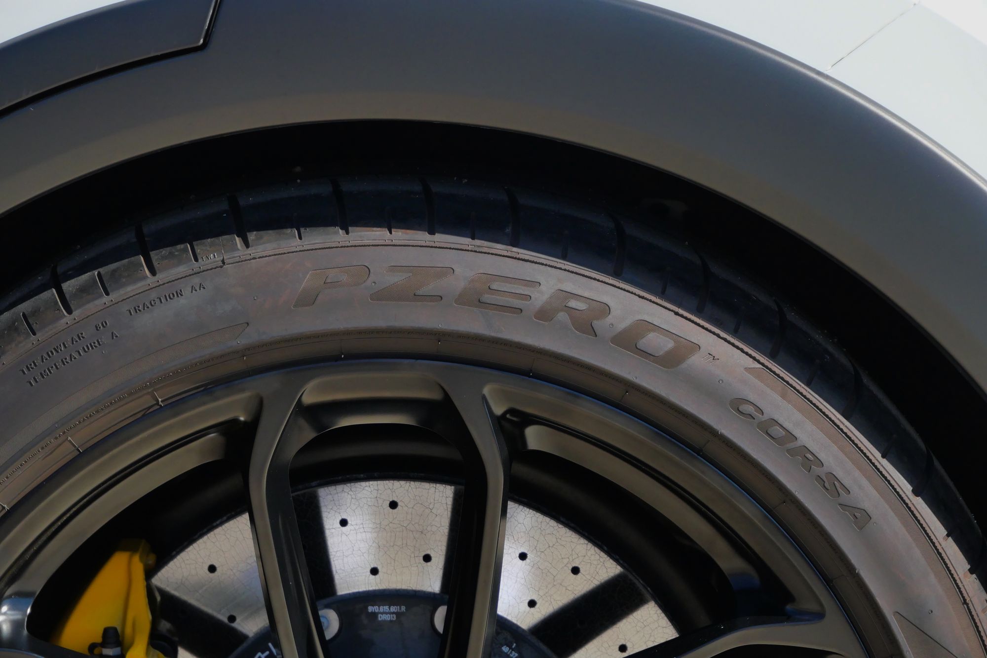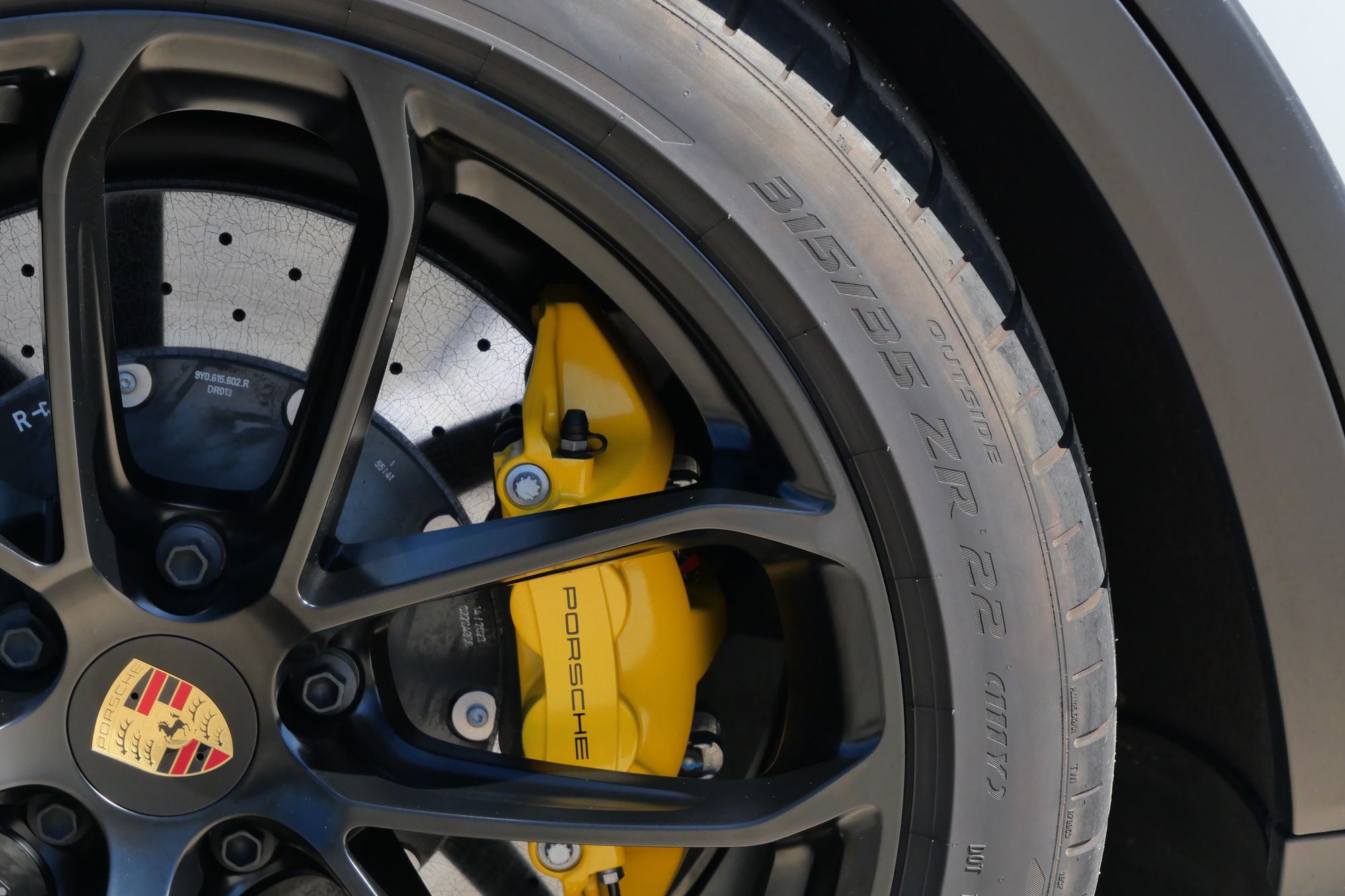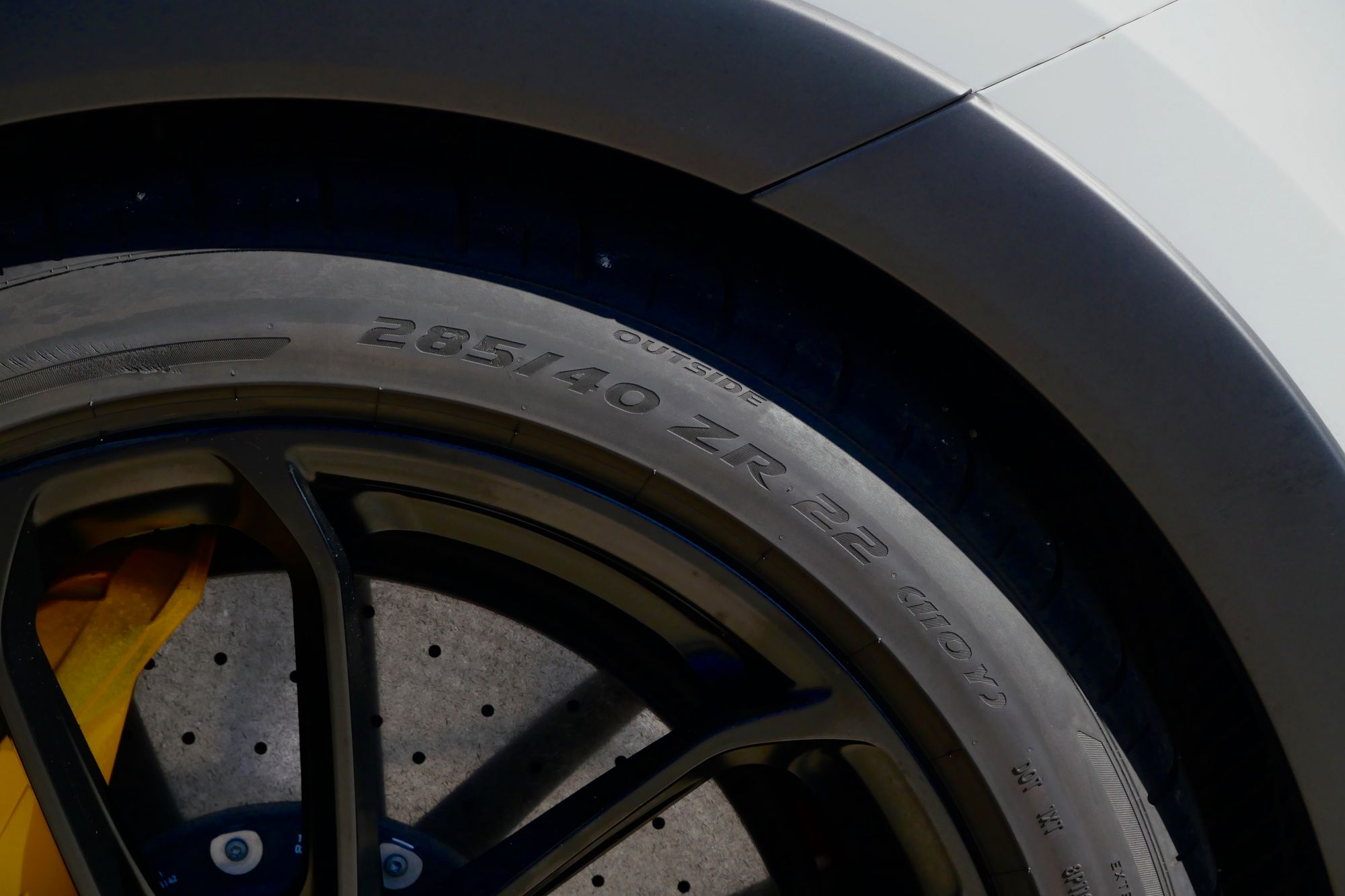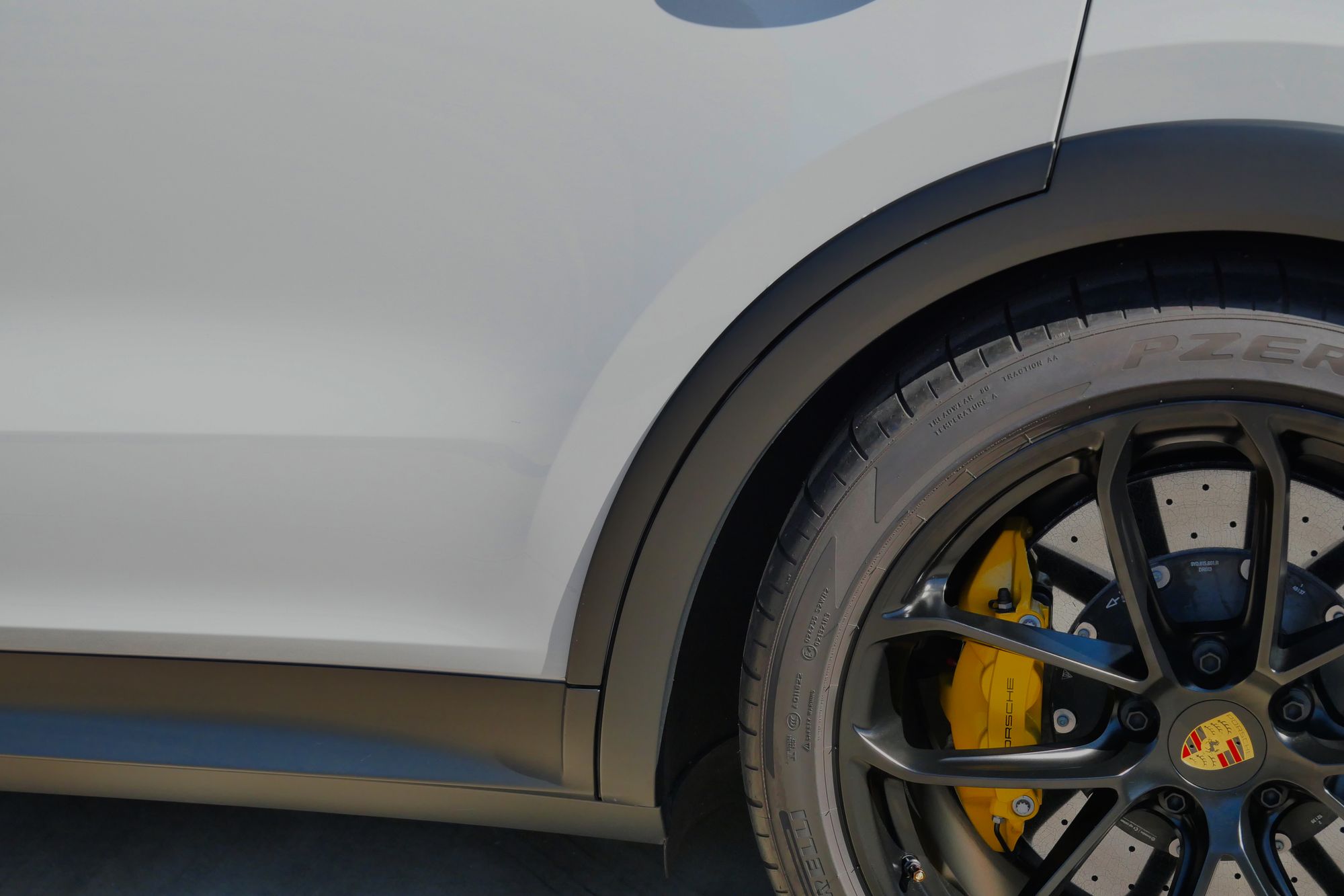 Satin Black-finished 22″ GT Design wheels are mounted with 285/40 front and 315/35 rear Pirelli P Zero Corsa tires. Factory equipment included adjustable air suspension, Porsche Active Suspension Management (PASM), and Porsche Dynamic Chassis Control (PDCC). Braking is provided by Porsche Ceramic Composite Brakes (PCCB) with cross-drilled rotors and yellow-finished calipers.