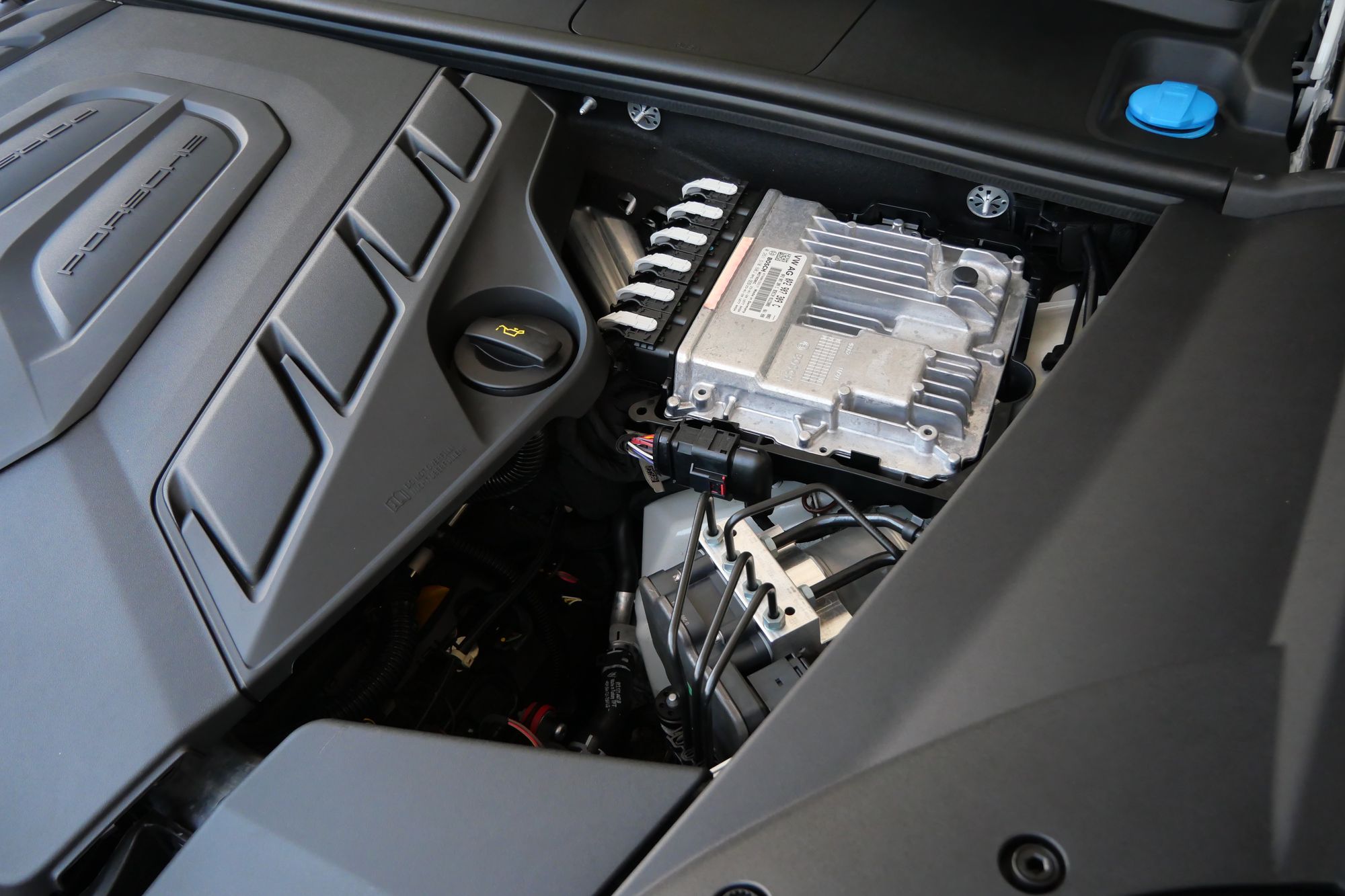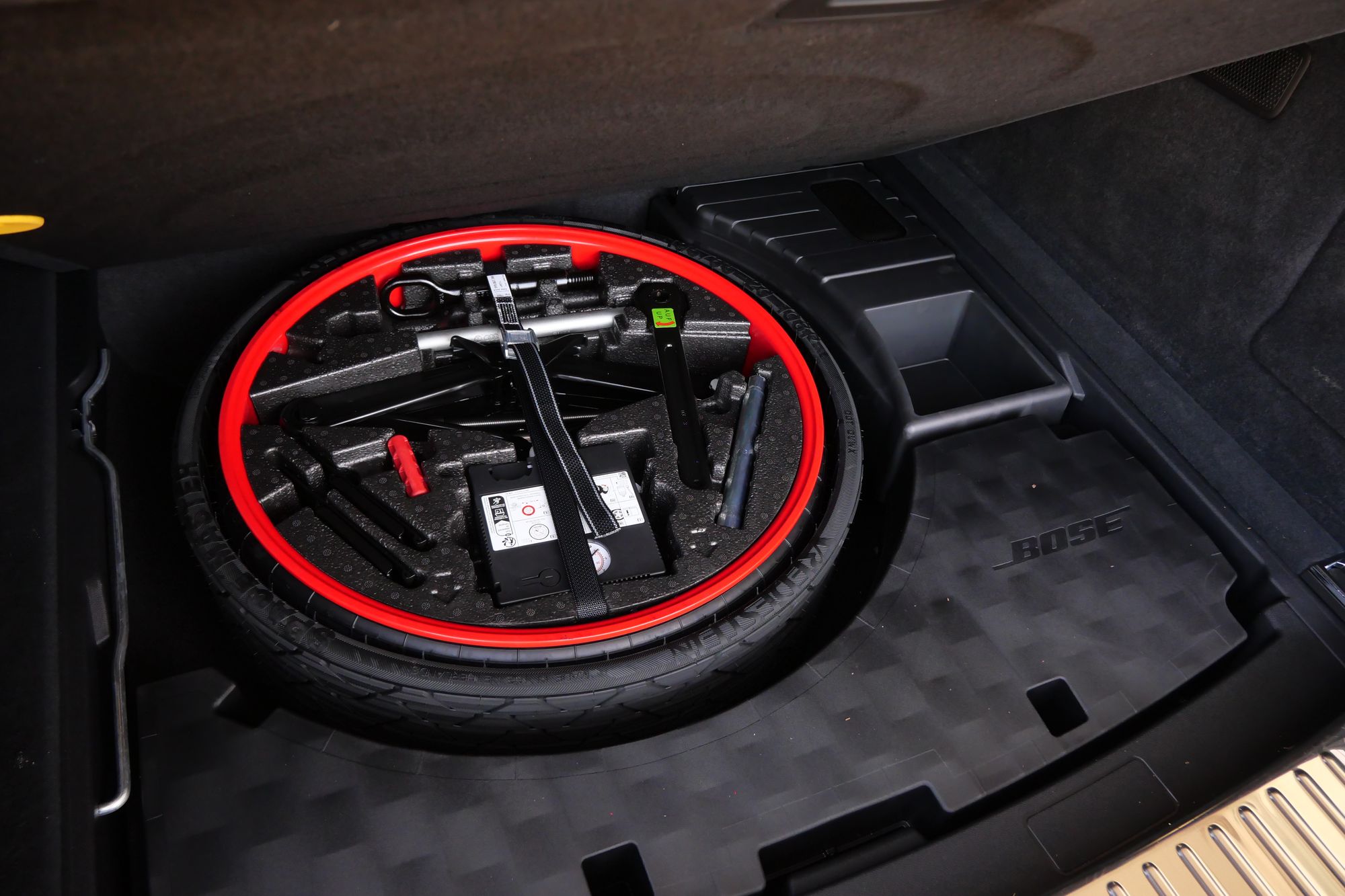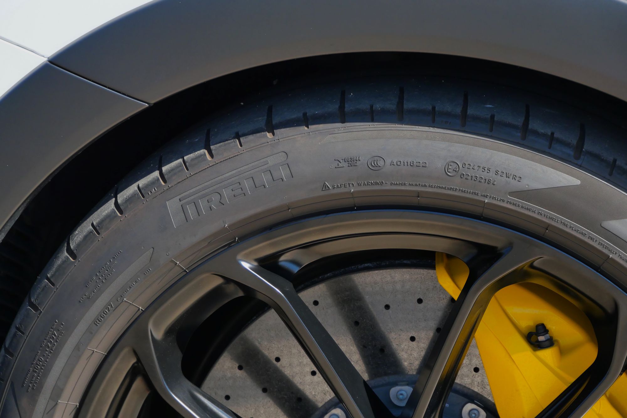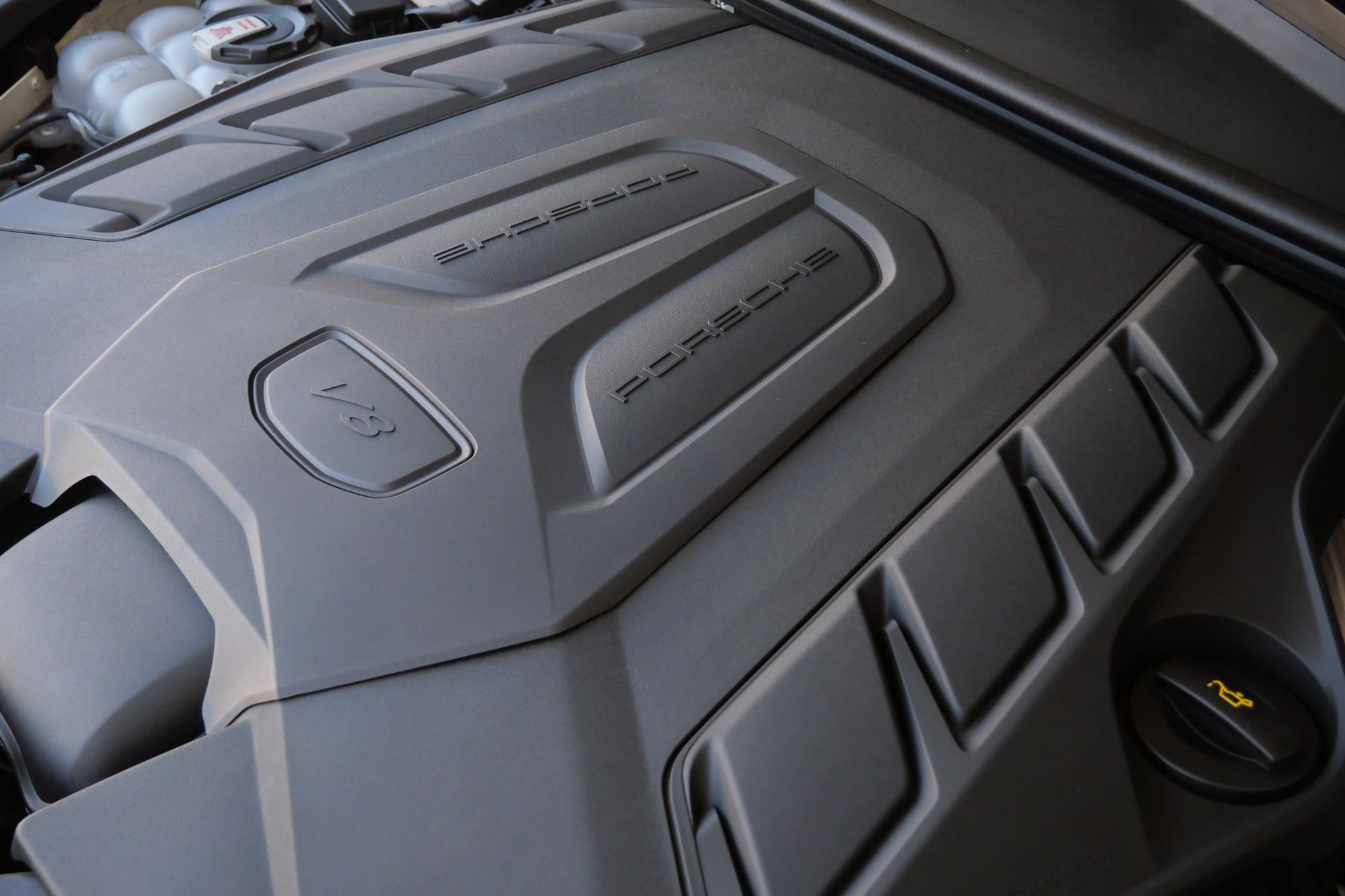 Satin Black-finished 22″ GT Design wheels are mounted with 285/40 front and 315/35 rear Pirelli P Zero Corsa tires. Factory equipment included adjustable air suspension, Porsche Active Suspension Management (PASM), and Porsche Dynamic Chassis Control (PDCC). Braking is provided by Porsche Ceramic Composite Brakes (PCCB) with cross-drilled rotors and yellow-finished calipers.