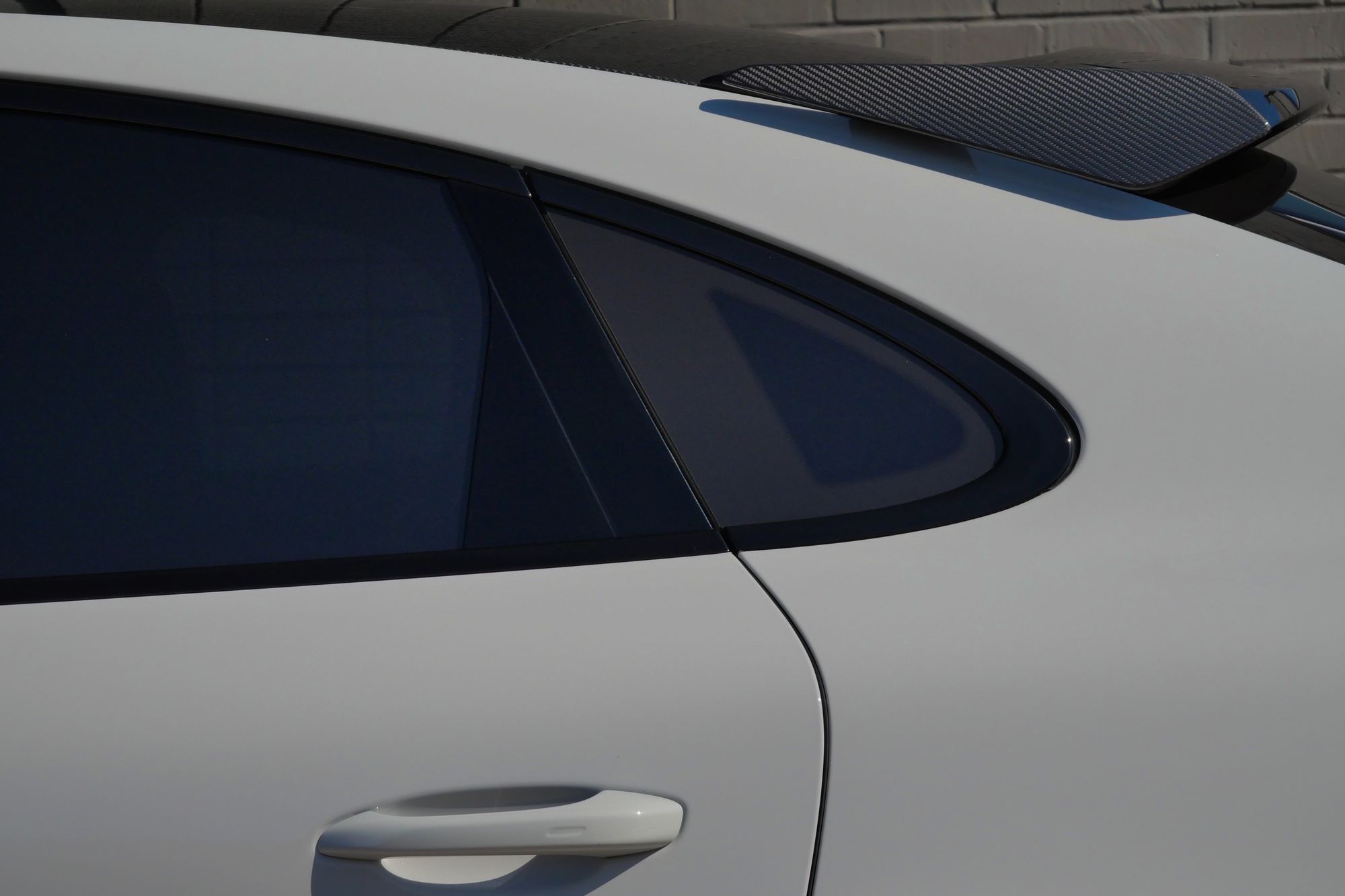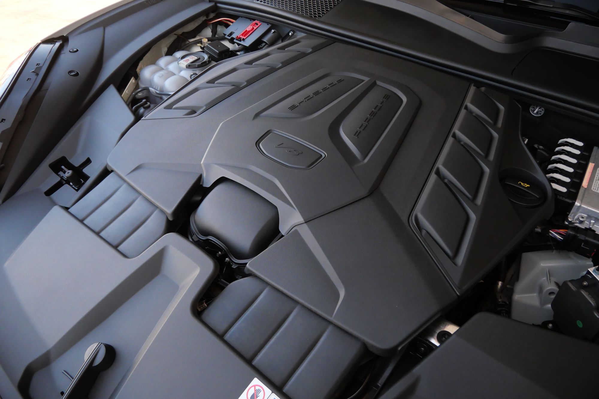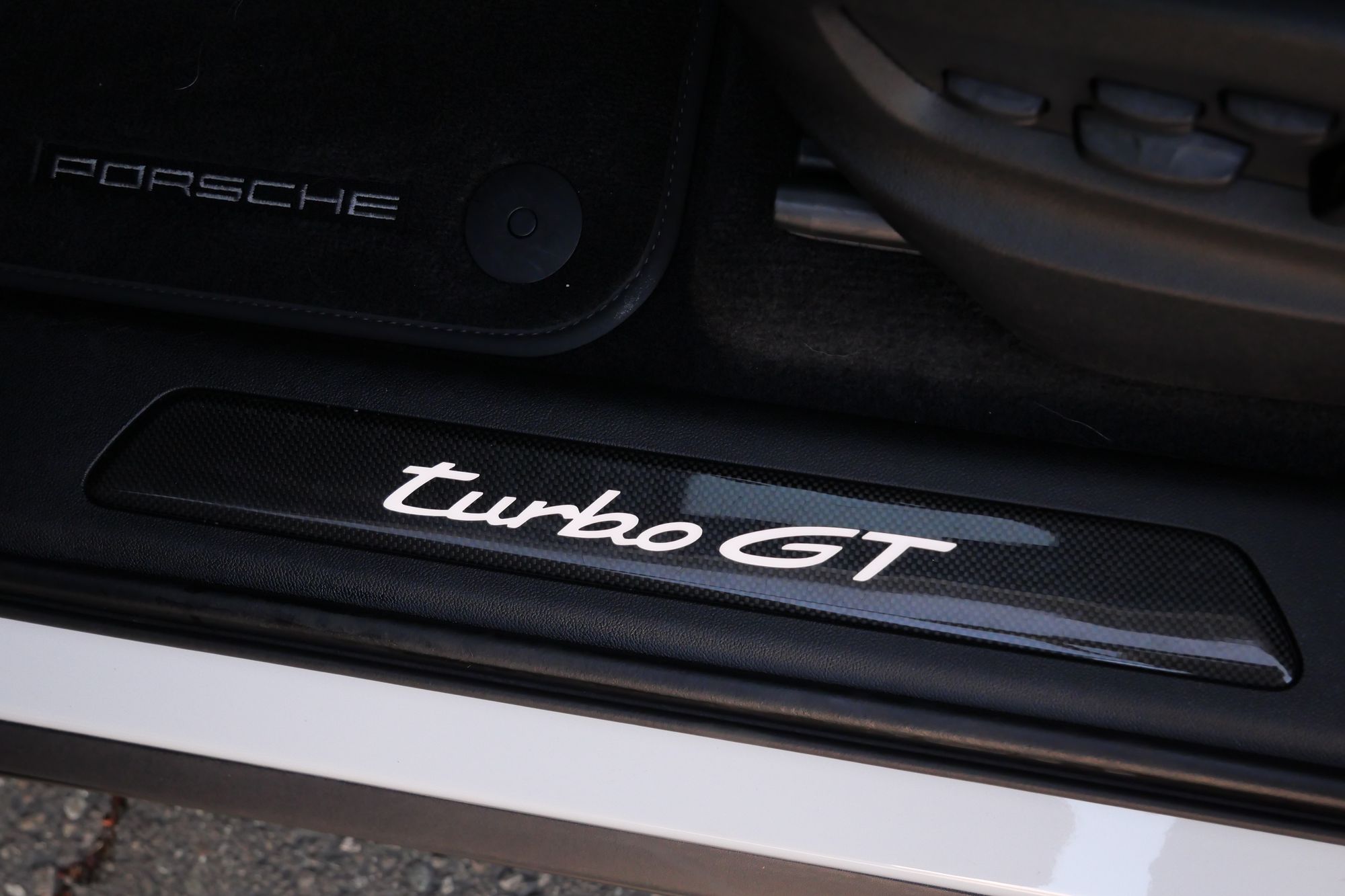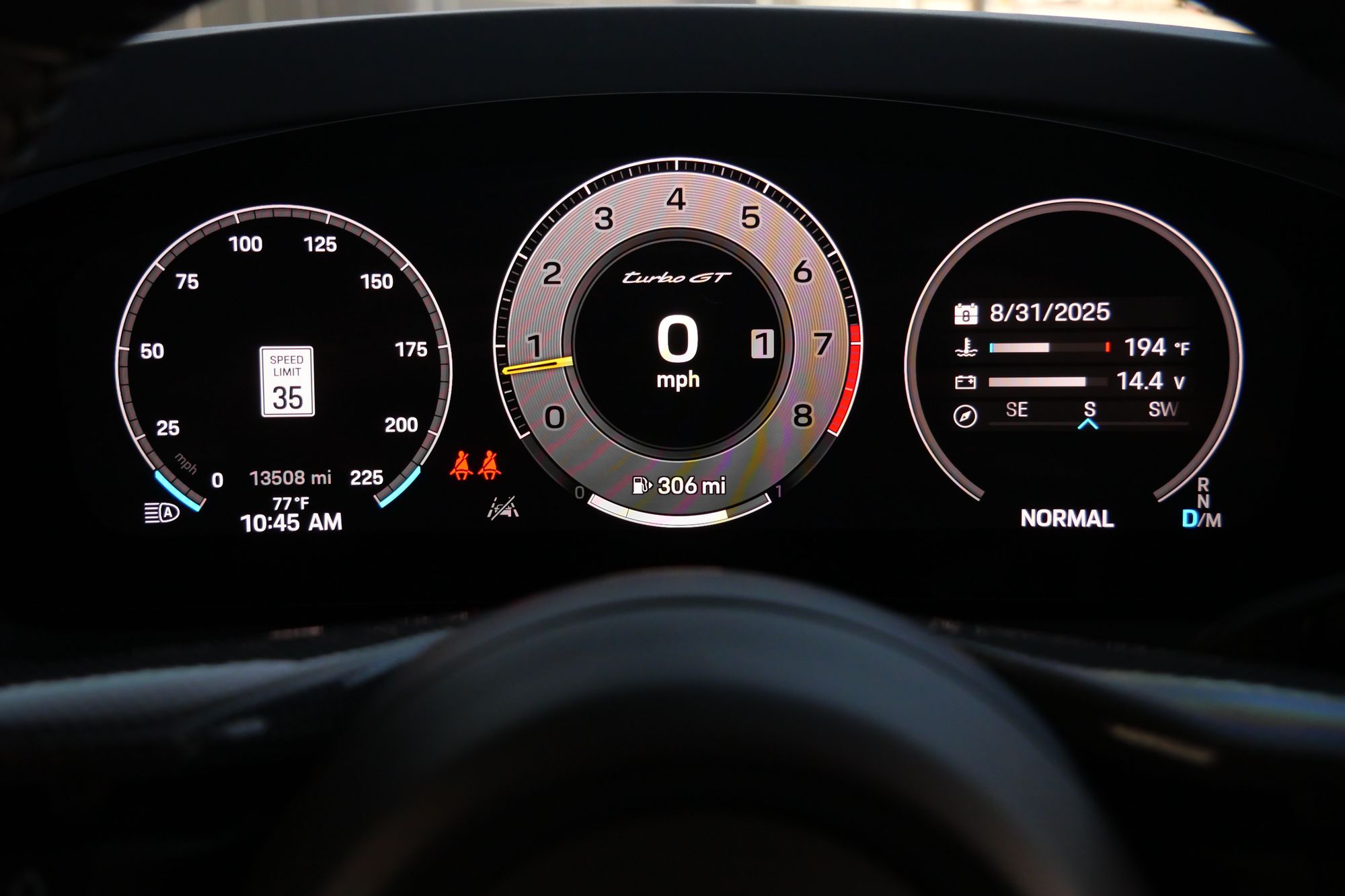 The heated leather-wrapped GT Sport steering wheel features carbon-fiber accents and frames a 12.6″ configurable digital instrument cluster with an odometer that indicates 14k miles. The twin-turbocharged 4.0-liter V8 was factory rated at 650 horsepower and 626 lb-ft of torque. Power is sent to all four wheels through an eight-speed Tiptronic S automatic transmission and a water-cooled all-wheel drive system
